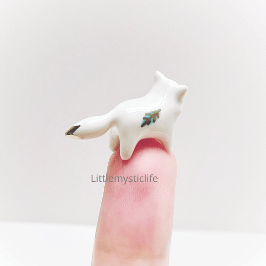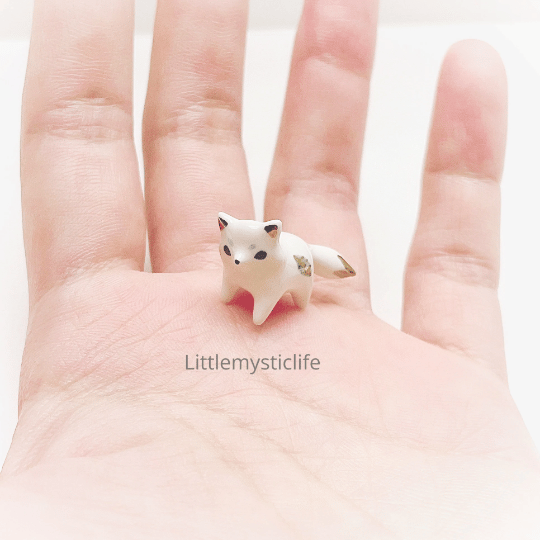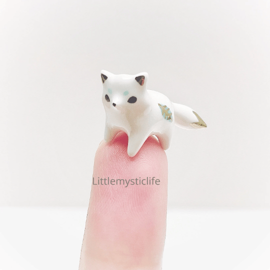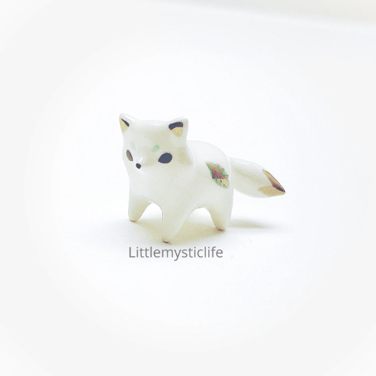 Leaf fox ceramic figurine is made of low fire earthen clay and Duncan underglaze for ceramic. In order to achieve the final looking pieces, I put a lot of time and care into sculpting, glazing, and firing my pieces at the right temperature. Delicate 22k gold details are painted by hand in these pieces for elegant and shiny looking. All my pieces are very small (about as big as your thumb), please handle them with care.