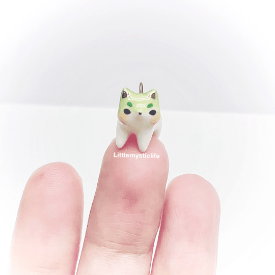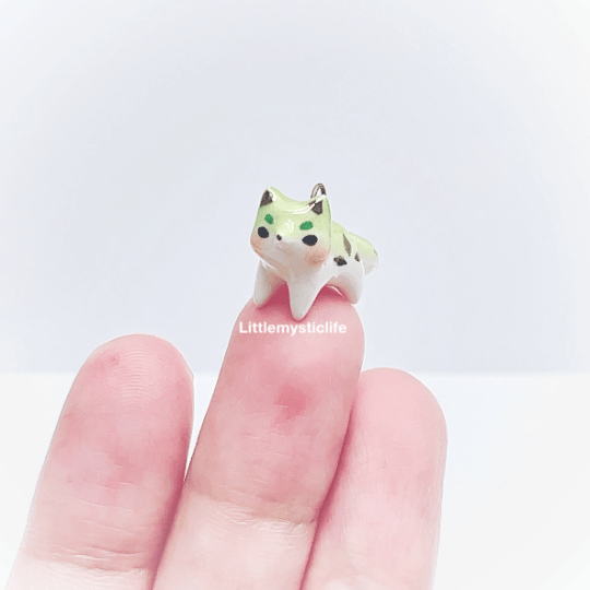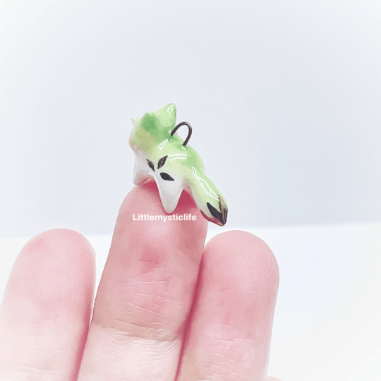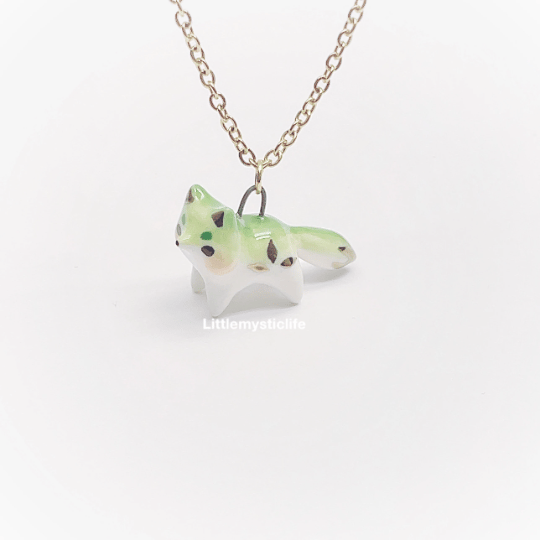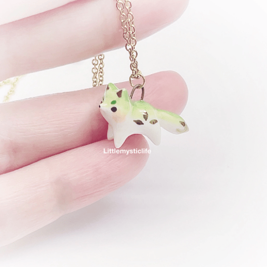 _Matcha fox ceramic necklace is made of low fire earthen clay and Duncan underglaze for ceramic. In order to achieve the final looking pieces, I put a lot of time and care into sculpting, glazing, and firing my pieces at the right temperature. Delicate 22k gold details are painted by hand in these pieces for elegant and shiny looking. All my pieces are very small (about as big as your thumb), please handle them with care and I recommend to take off your necklace while sleeping and showering.