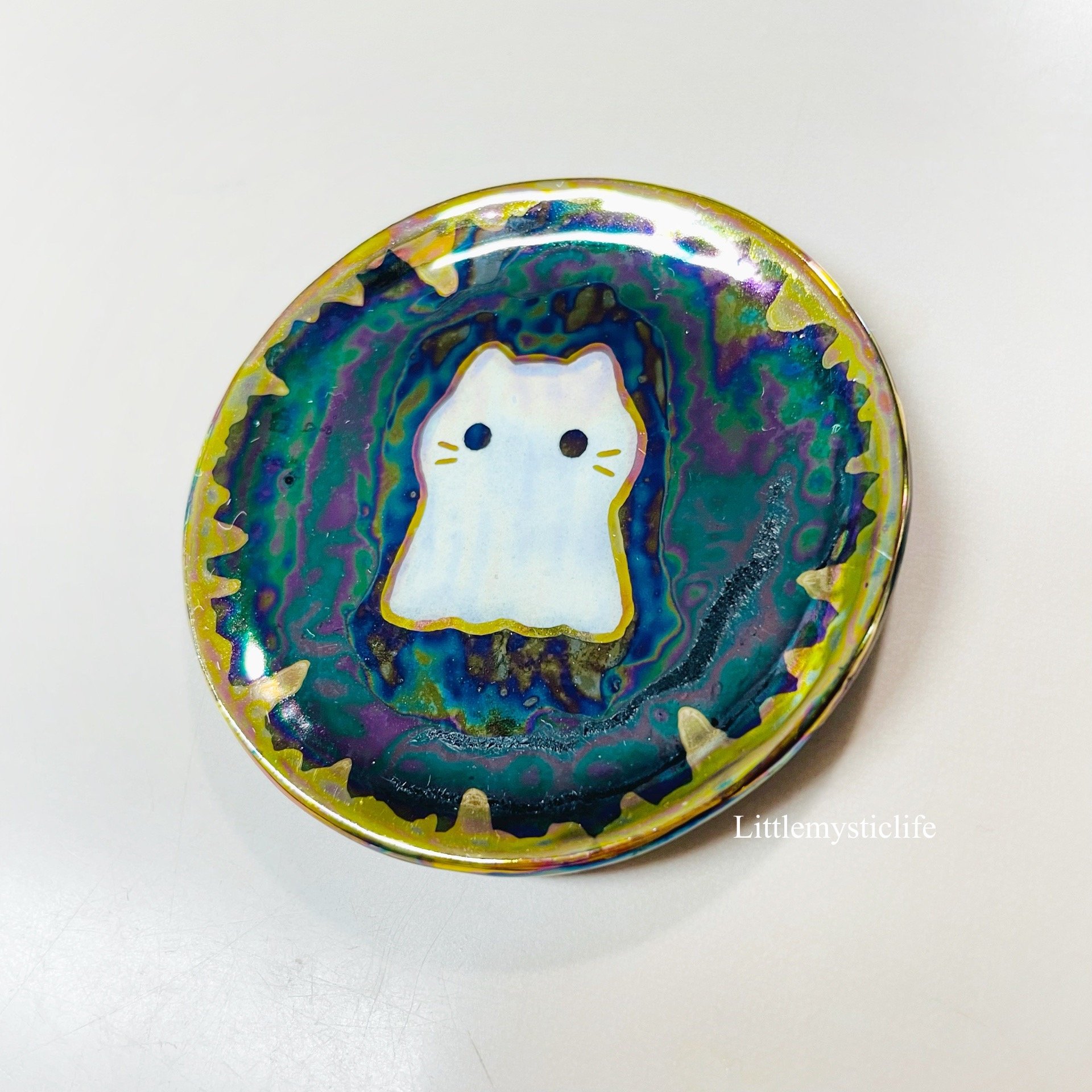 Mini ghost cat trinket dish with rainbow effect (2.5 inches diameter)