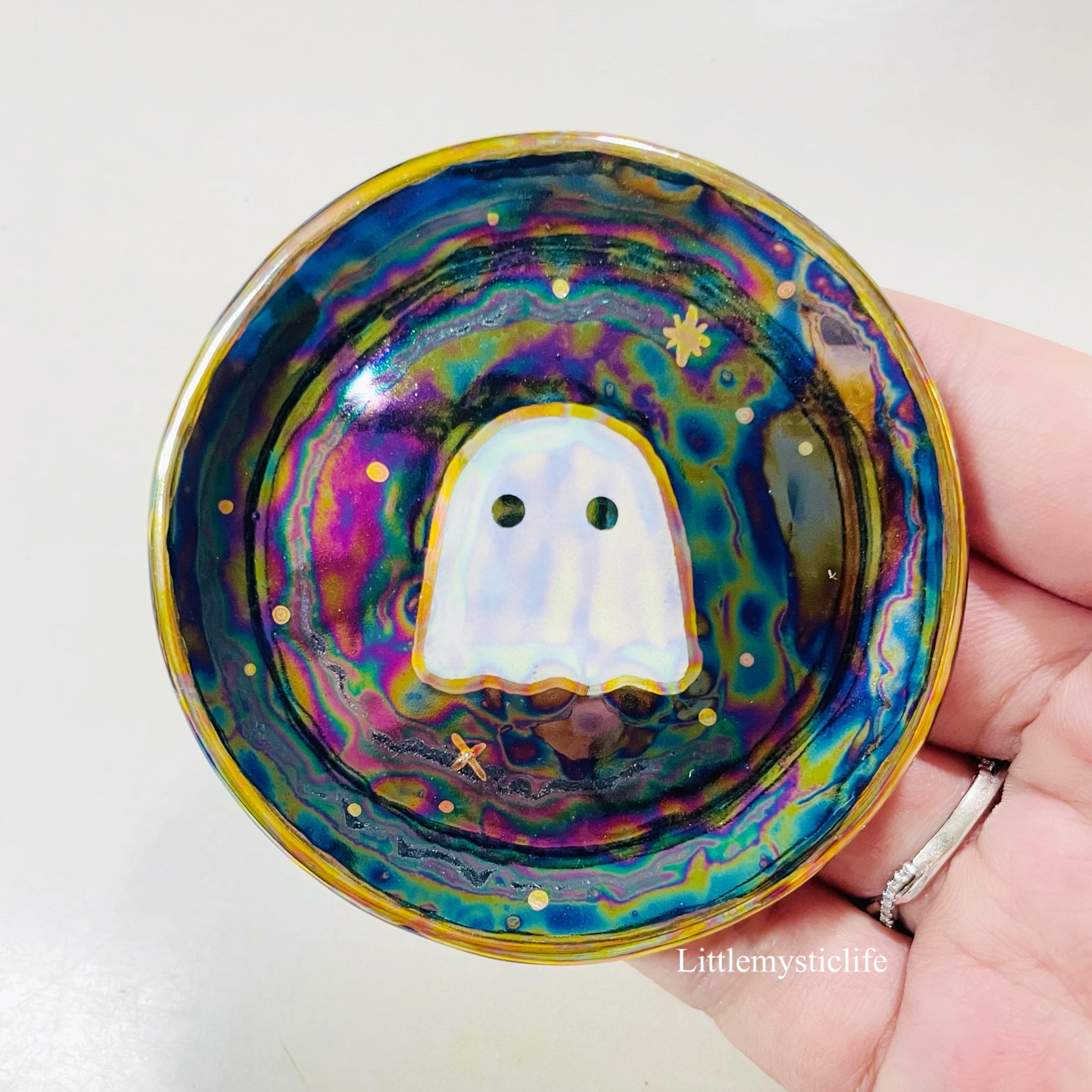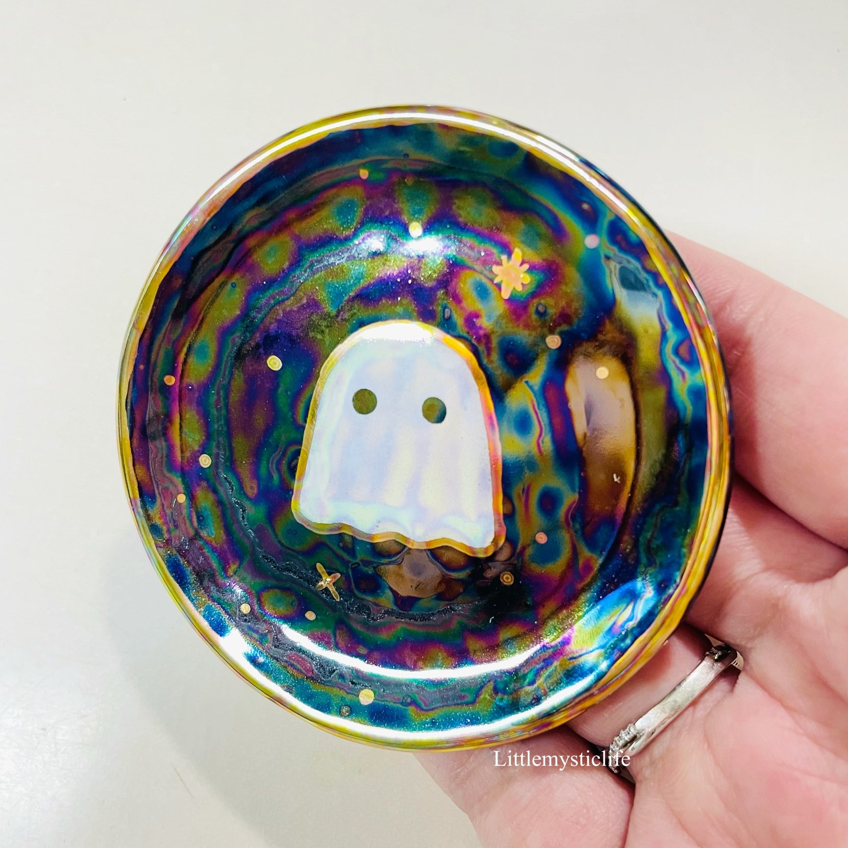 Mini Ghost trinket dish is made of low fire earthen clay and Duncan underglaze for ceramic. This small trinket dish is about 2.5 inches in diameter or 6 cm in diameter. In order to achieve the final looking pieces, I put a lot of time and care into sculpting, glazing, and firing my pieces at the right temperature. Delicate 22k gold details are painted by hand in these pieces for elegant and shiny looking. This dish also has rainbow effect.