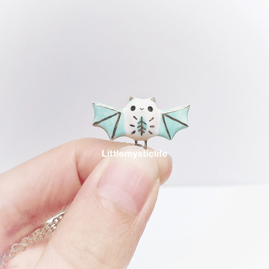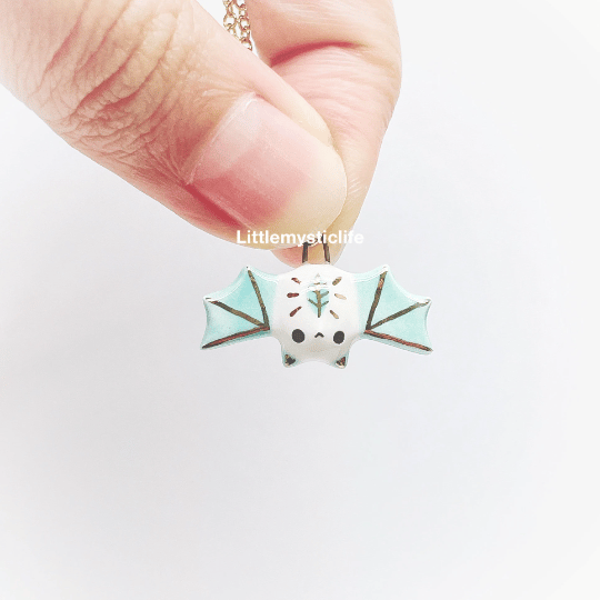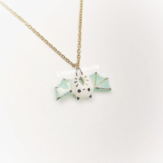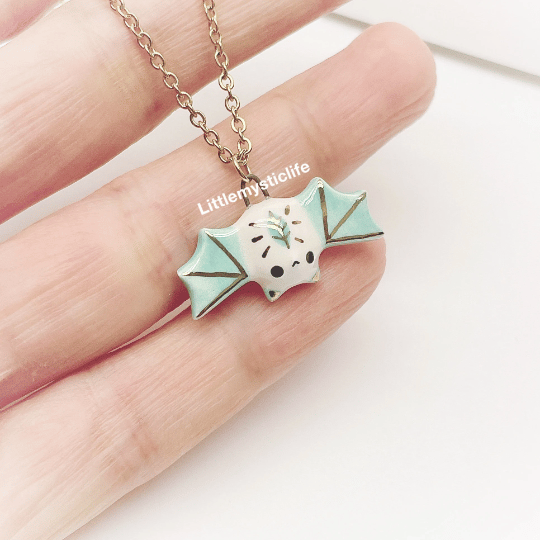 _Mint bat ceramic necklace is made of low fire earthen clay and Duncan underglaze for ceramic. In order to achieve the final looking pieces, I put a lot of time and care into sculpting, glazing, and firing my pieces at the right temperature. Delicate 22k gold details are painted by hand in these pieces for elegant and shiny looking. All my pieces are very small (about as big as your thumb), please handle them with care and I recommend to take off your necklace while sleeping and showering.