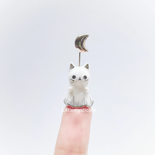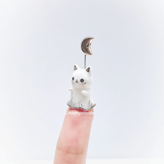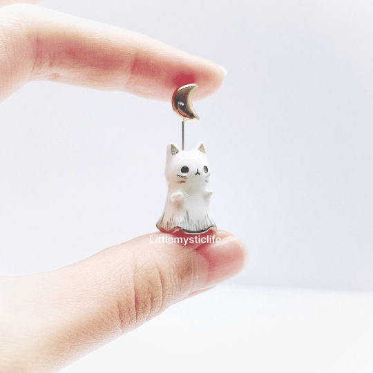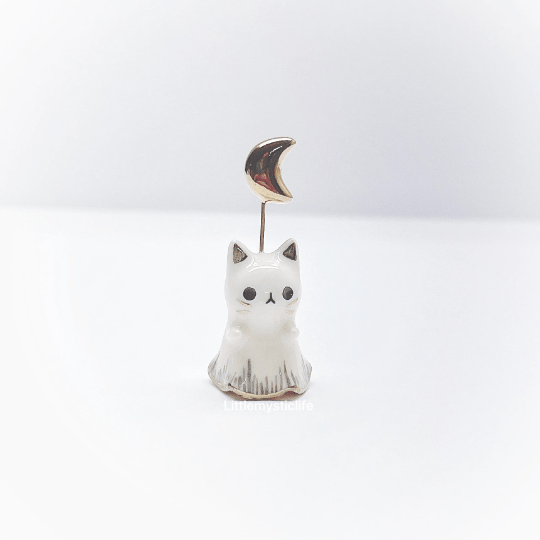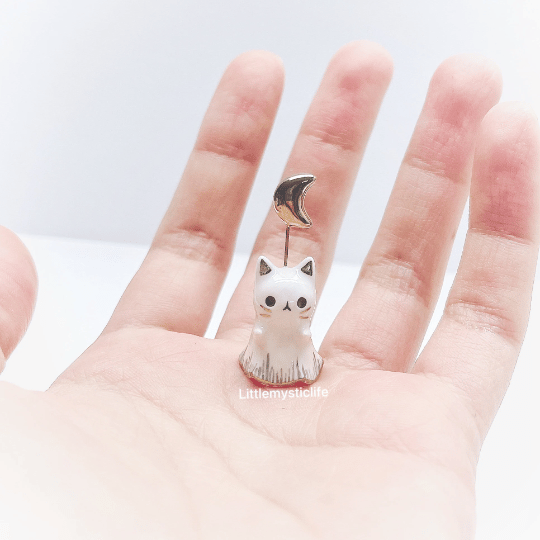 moon cat ceramic figurine is made of low fire earthen clay and Duncan underglaze for ceramic. In order to achieve the final looking pieces, I put a lot of time and care into sculpting, glazing, and firing my pieces at the right temperature. Delicate 22k gold details are painted by hand in these pieces for elegant and shiny looking. All my pieces are very small (about as big as your thumb), please handle them with care.