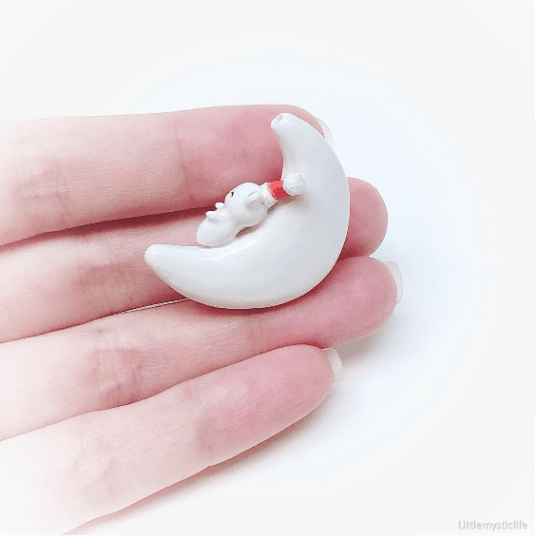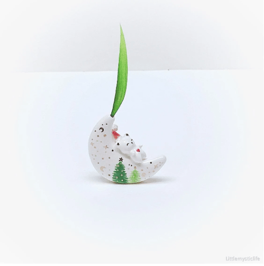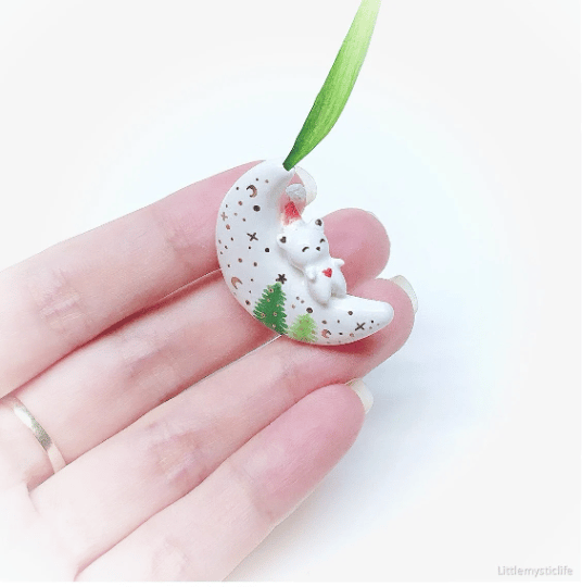 Moon christmas bear ceramic figurine is made of low fire earthen clay and Duncan underglaze for ceramic. In order to achieve the final looking pieces, I put a lot of time and care into sculpting, glazing, and firing my pieces at the right temperature. Delicate 22k gold details are painted by hand in these pieces for elegant and shiny looking. All my pieces are very small (about as big as your thumb), please handle them with care and I recommend to take off your necklace while sleeping and showering.