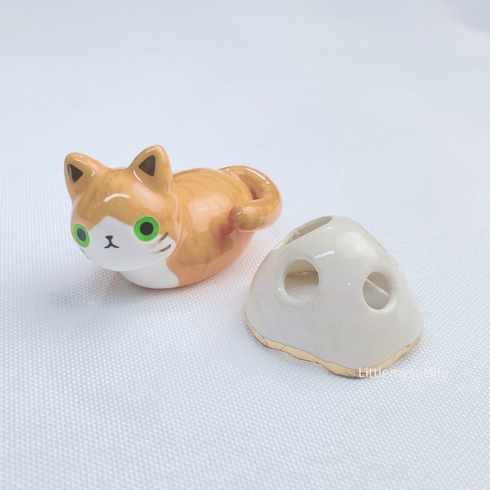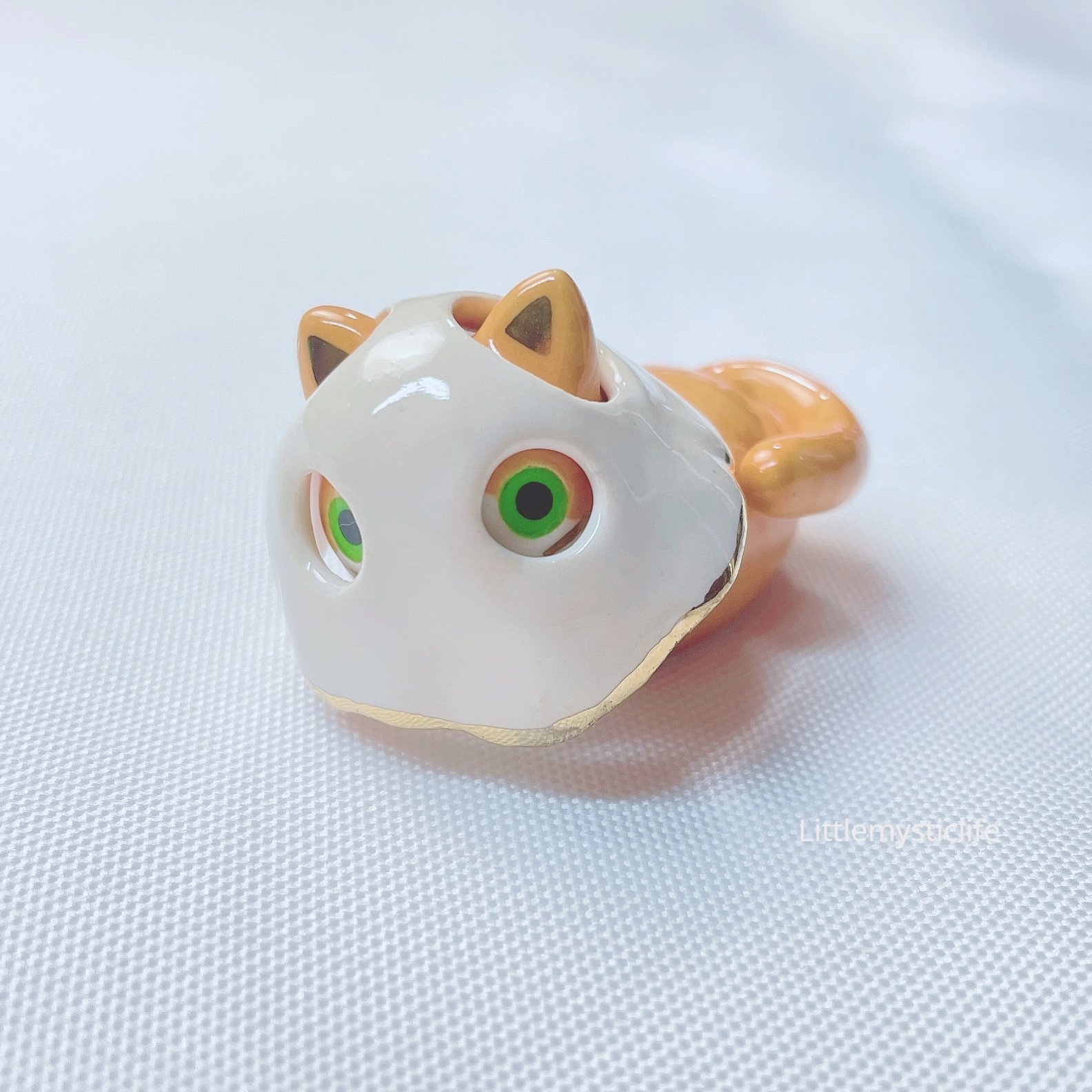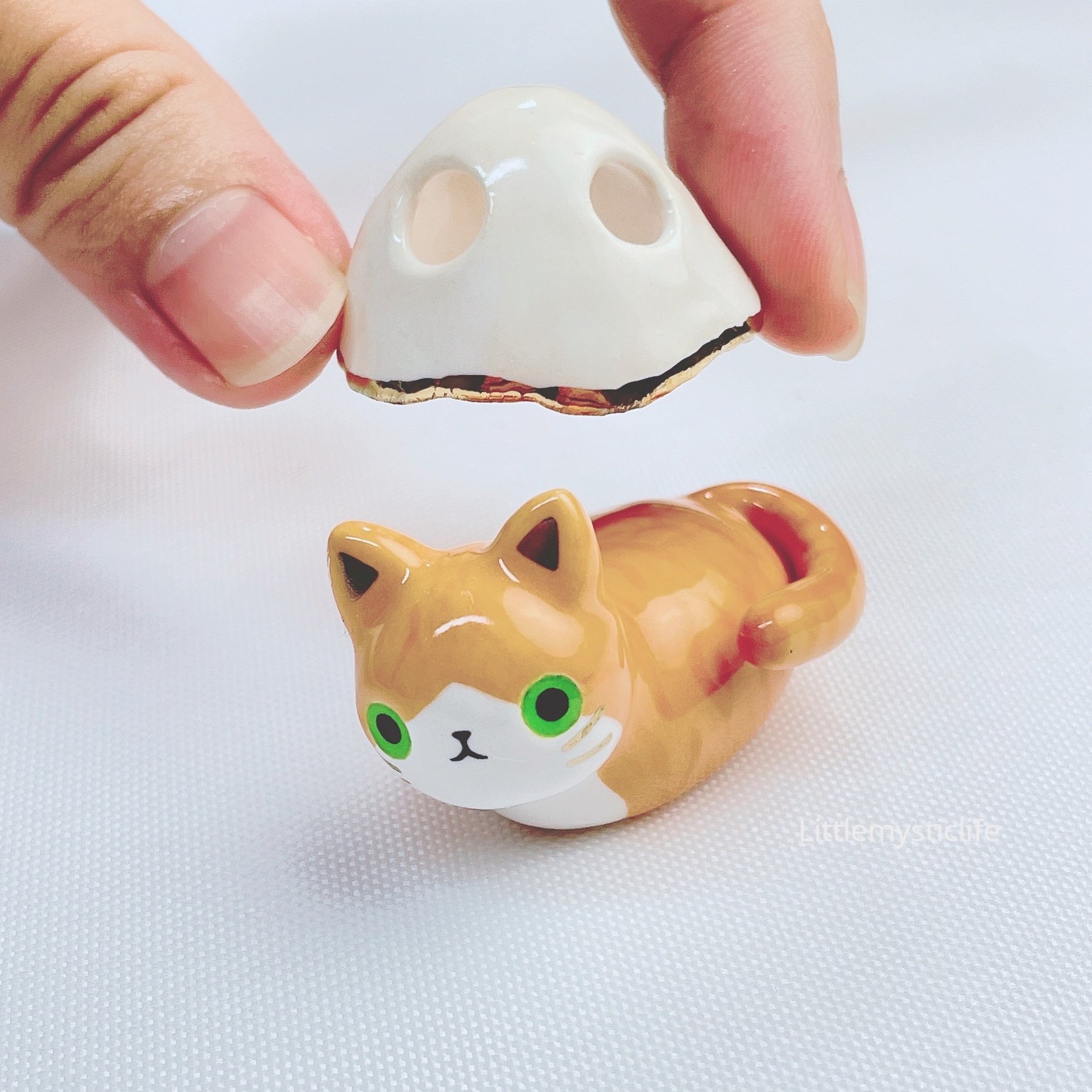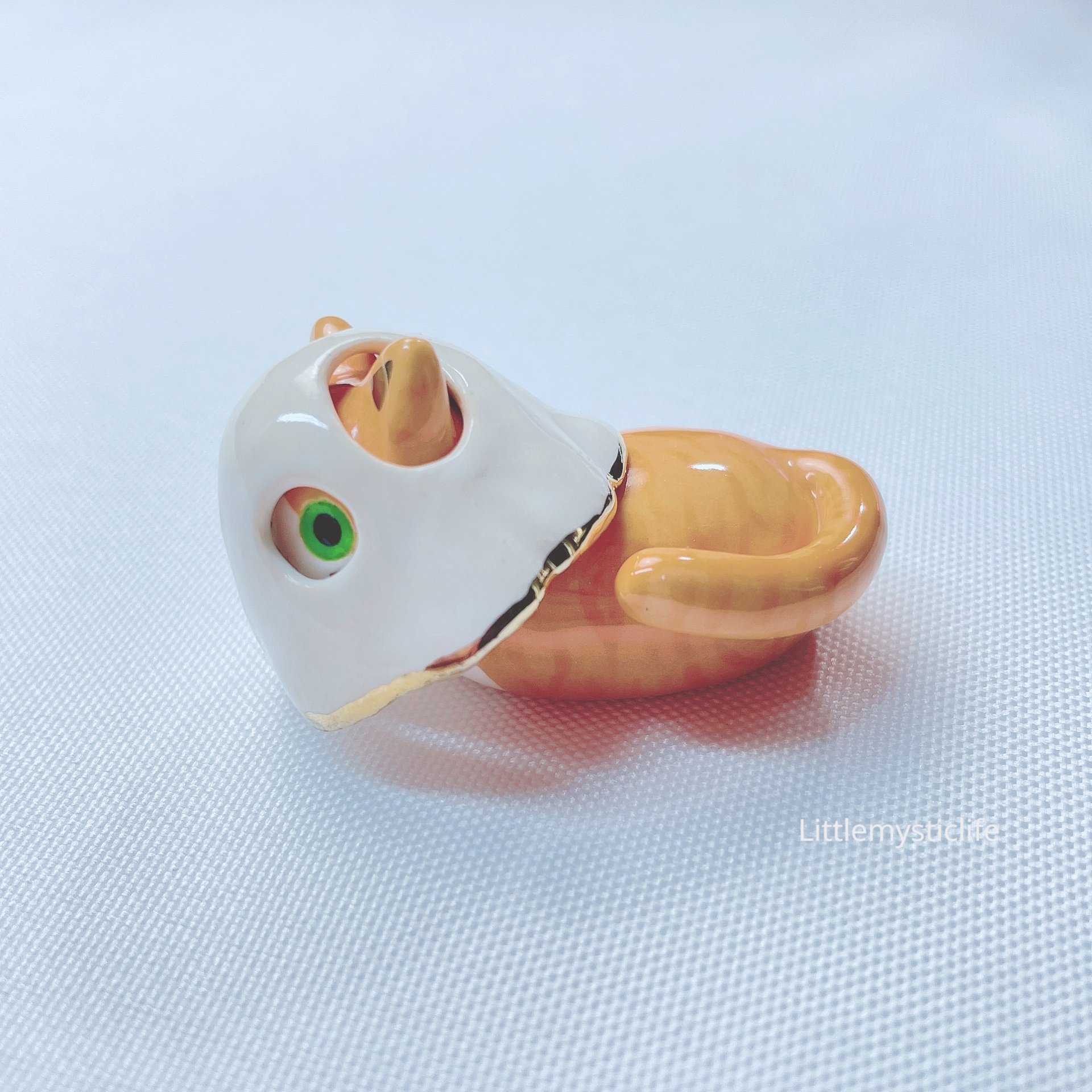 Orange cat with ghost mask ceramic figurine is made of low fire earthen clay and Duncan underglaze for ceramic. In order to achieve the final looking pieces, I put a lot of time and care into sculpting, glazing, and firing my pieces at the right temperature. Delicate 22k gold details are painted by hand in these pieces for elegant and shiny looking. Please handle them with care.