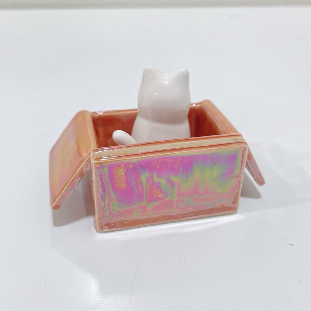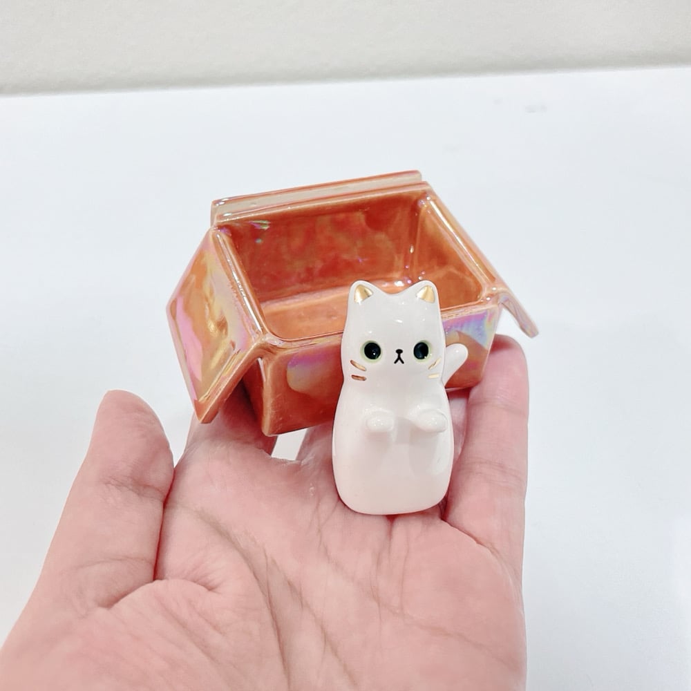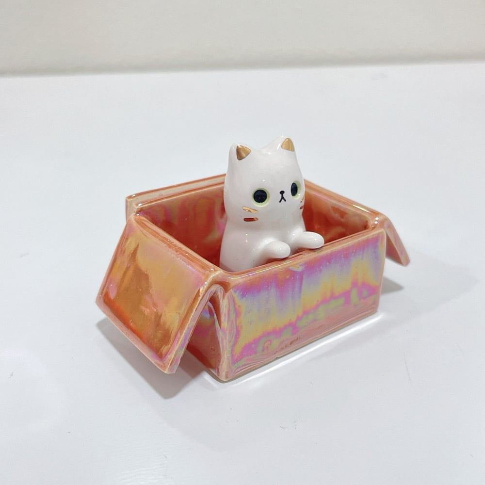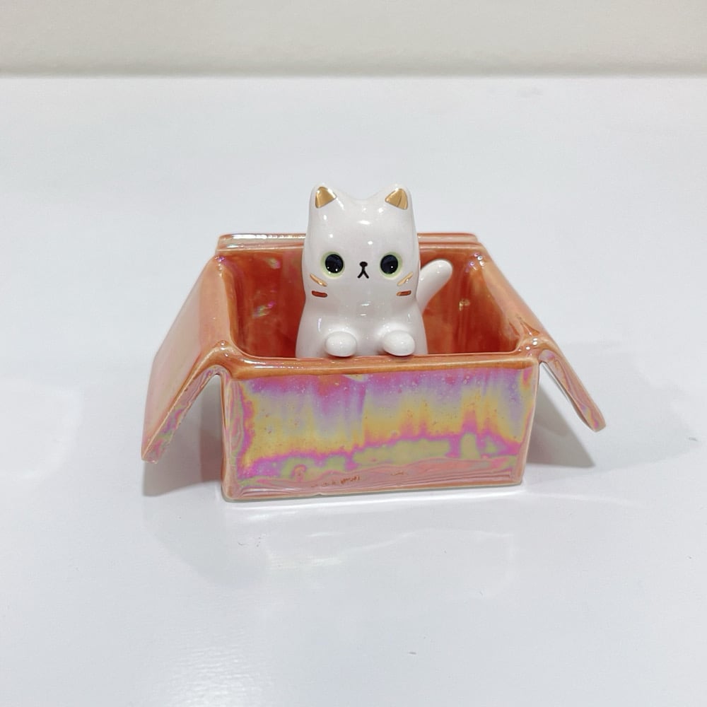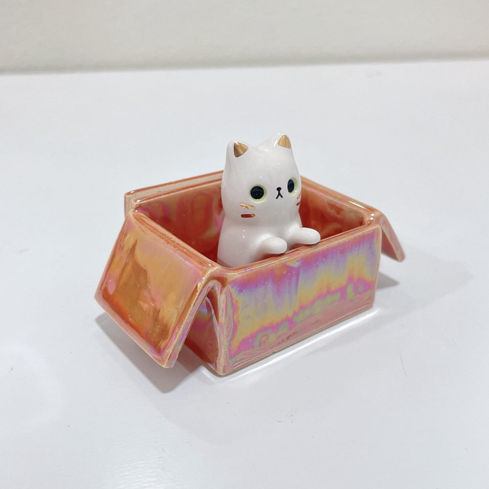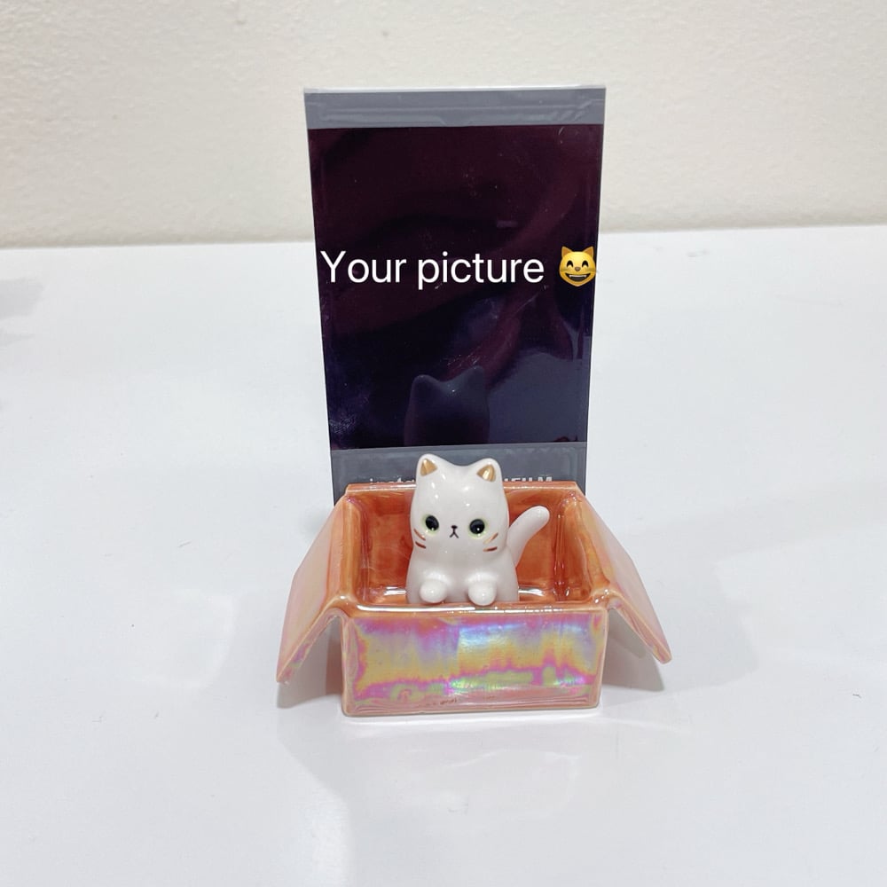 Picture holder white cat in the box ceramic keepsake is made of low fire earthen clay for ceramic. The picture I use here is a polaroid but you can use any type of pictures. In order to achieve the final looking pieces, I put a lot of time and care into sculpting, glazing, and firing my pieces at the right temperature. Delicate 22k gold details are painted by hand in these pieces for elegant and shiny looking. The box has rainbow effect!