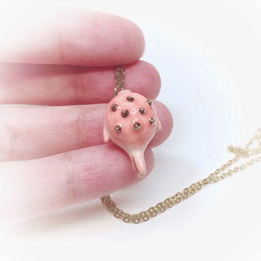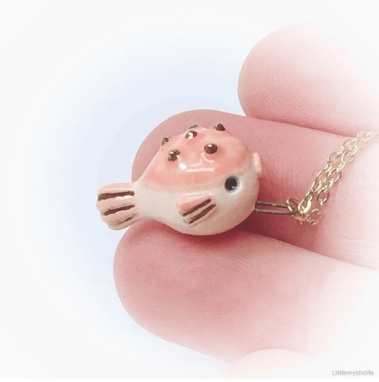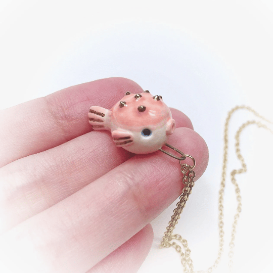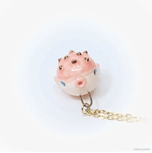 _Puffer fish ceramic necklace is made of low fire earthen clay and Duncan underglaze for ceramic. In order to achieve the final looking pieces, I put a lot of time and care into sculpting, glazing, and firing my pieces at the right temperature. Delicate 22k gold details are painted by hand in these pieces for elegant and shiny looking. All my pieces are very small (about as big as your thumb), please handle them with care and I recommend to take off your necklace while sleeping and showering.
