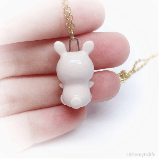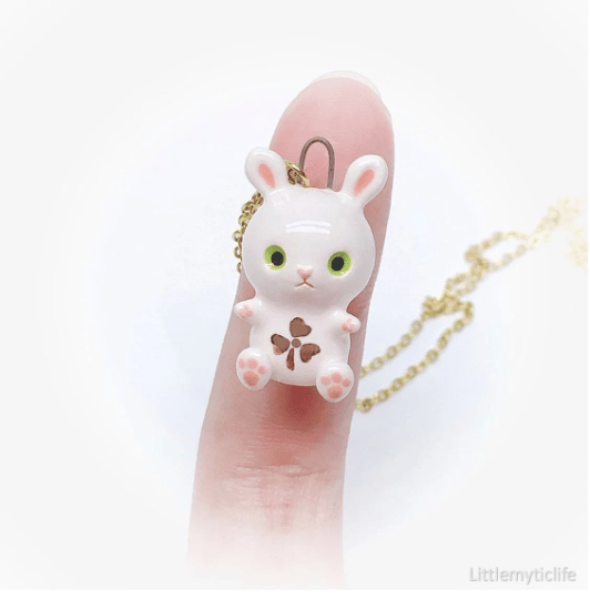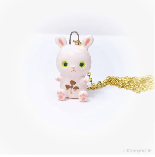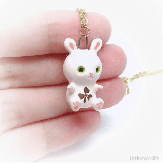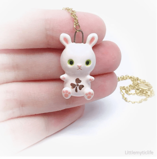 _Rabbit ceramic necklace is made of low fire earthen clay and Duncan underglaze for ceramic. In order to achieve the final looking pieces, I put a lot of time and care into sculpting, glazing, and firing my pieces at the right temperature. Delicate 22k gold details are painted by hand in these pieces for elegant and shiny looking. All my pieces are very small (about as big as your thumb), please handle them with care and I recommend to take off your necklace while sleeping and showering.