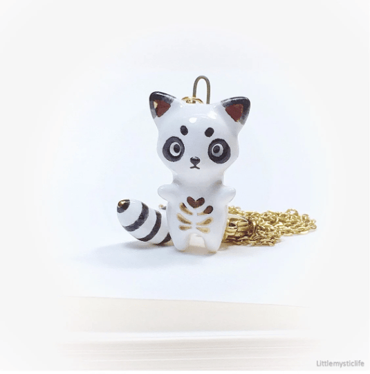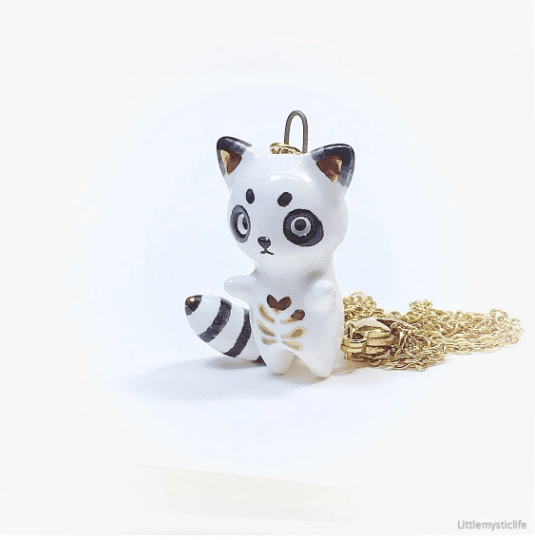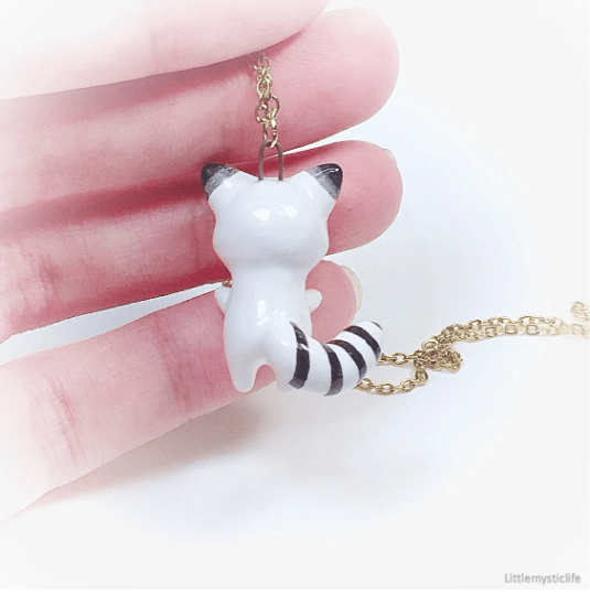 _Raccoon ceramic necklace is made of low fire earthen clay and Duncan underglaze for ceramic. In order to achieve the final looking pieces, I put a lot of time and care into sculpting, glazing, and firing my pieces at the right temperature. Delicate 22k gold details are painted by hand in these pieces for elegant and shiny looking. All my pieces are very small (about as big as your thumb), please handle them with care and I recommend to take off your necklace while sleeping and showering.