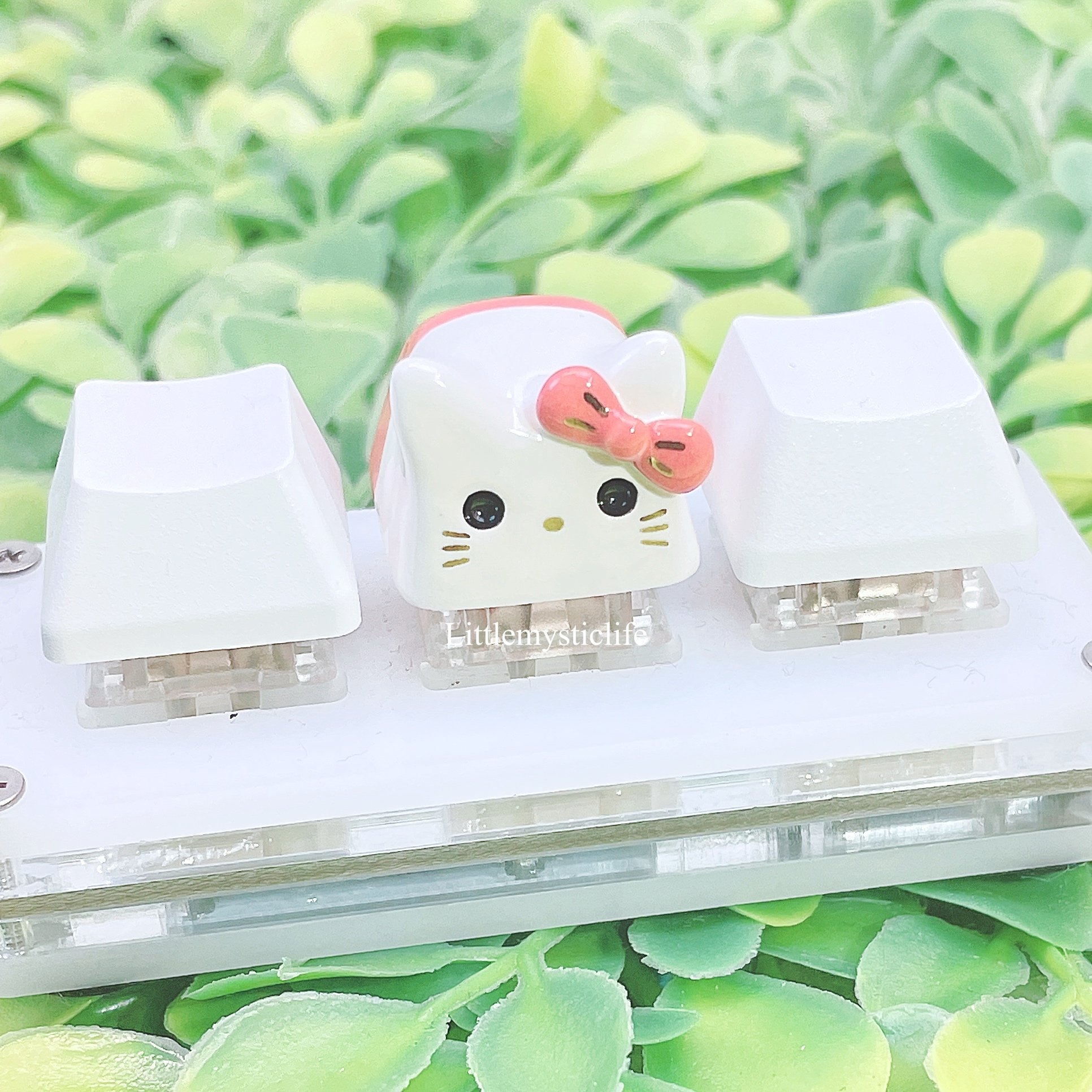 Keycap kitty is made of low fire earthen clay and Duncan underglaze for ceramic. In order to achieve the final looking pieces, I put a lot of time and care into sculpting, glazing, and firing my pieces at the right temperature. Delicate 22k gold details are painted by hand in these pieces for elegant and shiny looking. All my pieces are very small (about as big as your thumb), please handle them with care.