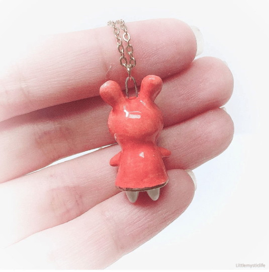 _Bunny ceramic necklace is made of low fire earthen clay and Duncan underglaze for ceramic. In order to achieve the final looking pieces, I put a lot of time and care into sculpting, glazing, and firing my pieces at the right temperature. Delicate 22k gold details are painted by hand in these pieces for elegant and shiny looking. All my pieces are very small (about as big as your thumb), please handle them with care and I recommend to take off your necklace while sleeping and showering.