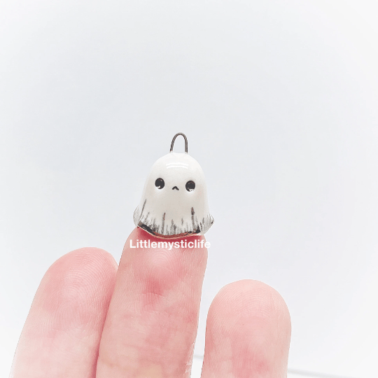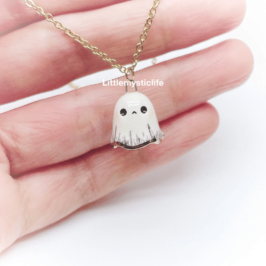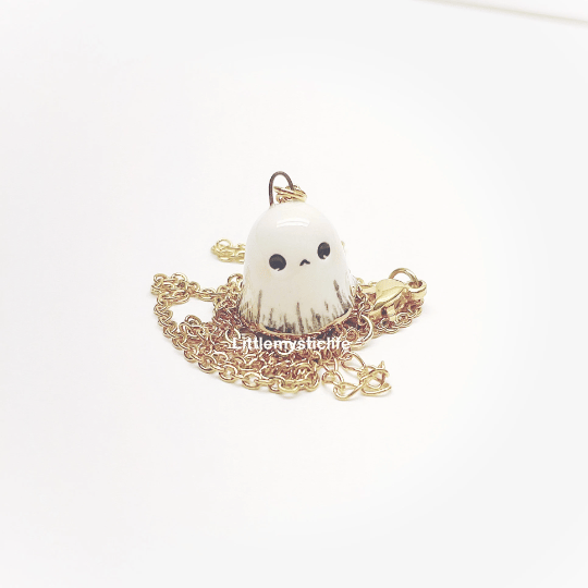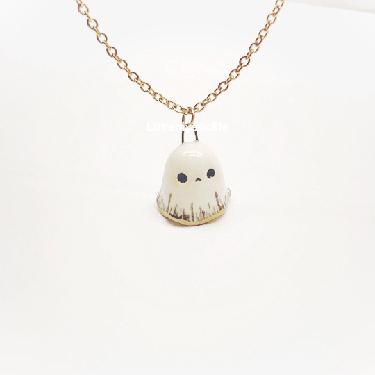 _ Sad ghost ceramic necklace is made of low fire earthen clay and Duncan underglaze for ceramic. In order to achieve the final looking pieces, I put a lot of time and care into sculpting, glazing, and firing my pieces at the right temperature. Delicate 22k gold details are painted by hand in these pieces for elegant and shiny looking. All my pieces are very small (about as big as your thumb), please handle them with care and I recommend to take off your necklace while sleeping and showering.