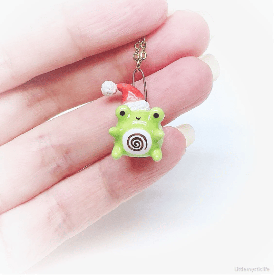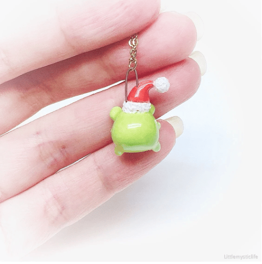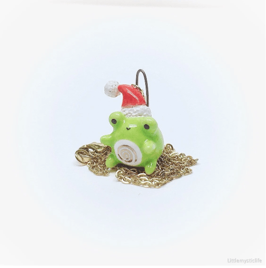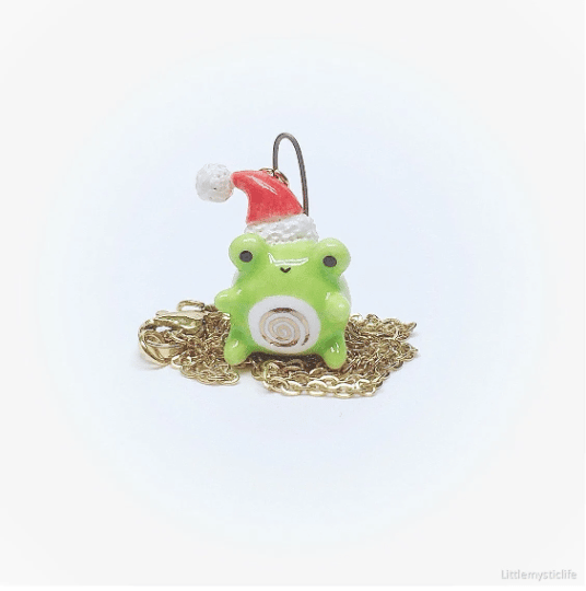 _ santa frog ceramic necklace is made of low fire earthen clay and Duncan underglaze for ceramic. In order to achieve the final looking pieces, I put a lot of time and care into sculpting, glazing, and firing my pieces at the right temperature. Delicate 22k gold details are painted by hand in these pieces for elegant and shiny looking. All my pieces are very small (about as big as your thumb), please handle them with care and I recommend to take off your necklace while sleeping and showering.