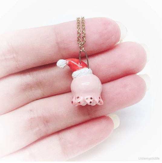 _ Santa octopus ceramic necklace is made of low fire earthen clay and Duncan underglaze for ceramic. In order to achieve the final looking pieces, I put a lot of time and care into sculpting, glazing, and firing my pieces at the right temperature. Delicate 22k gold details are painted by hand in these pieces for elegant and shiny looking. All my pieces are very small (about as big as your thumb), please handle them with care and I recommend to take off your necklace while sleeping and showering.