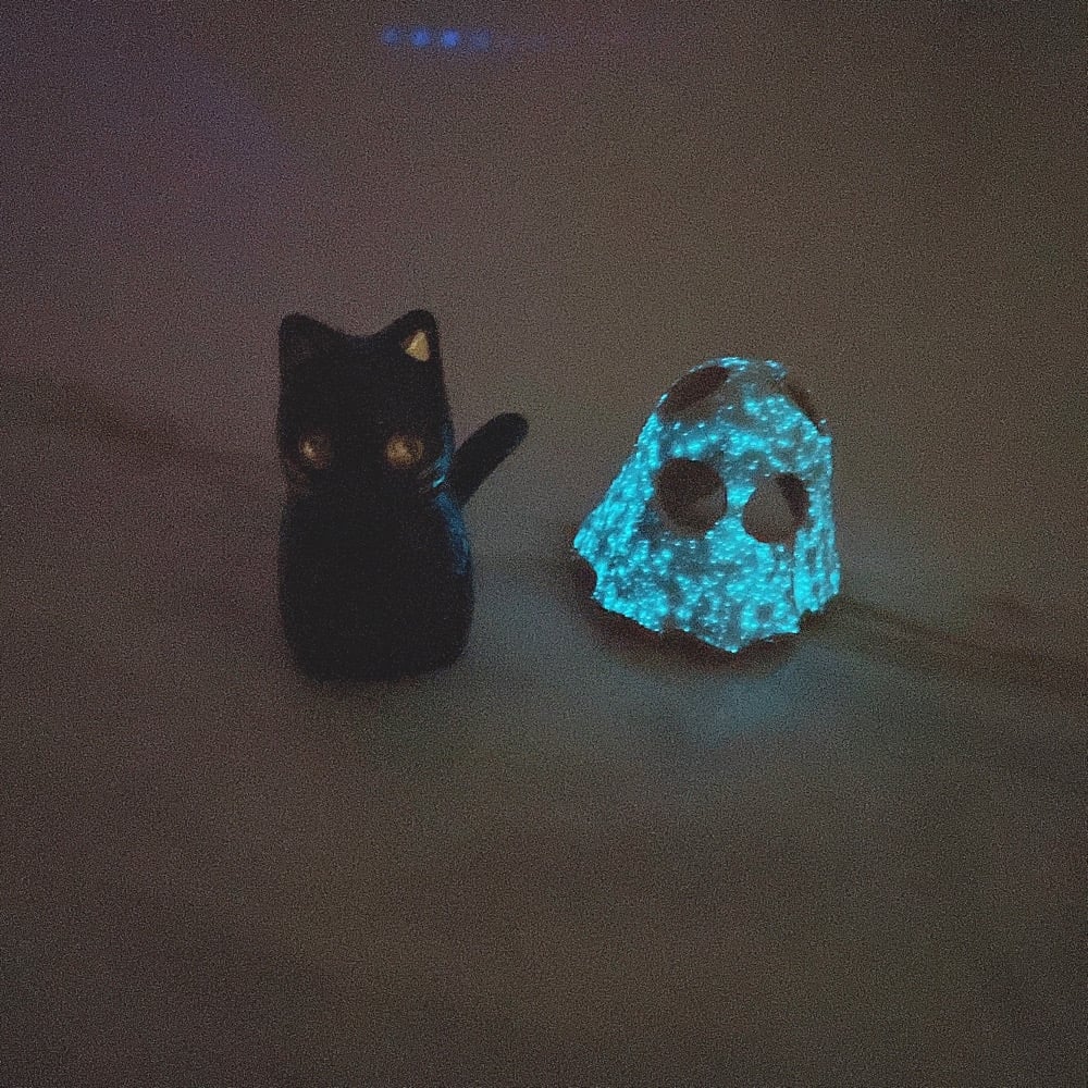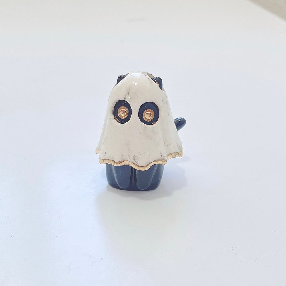 Black cat is made of low fire earthen clay and glow in dark glaze for ceramic. This cat ghost mask surface has bumpy texture naturally because of the glow in dark special mix glaze. Recharge glow in dark under the sun for 40 mins or under UV lamp for 10 mins. Glow light can only hold for 15-20 mins. In order to achieve the final looking pieces, I put a lot of time and care into sculpting, glazing, and firing my pieces at the right temperature. Delicate 22k gold details are painted by hand in these pieces for elegant and shiny looking.