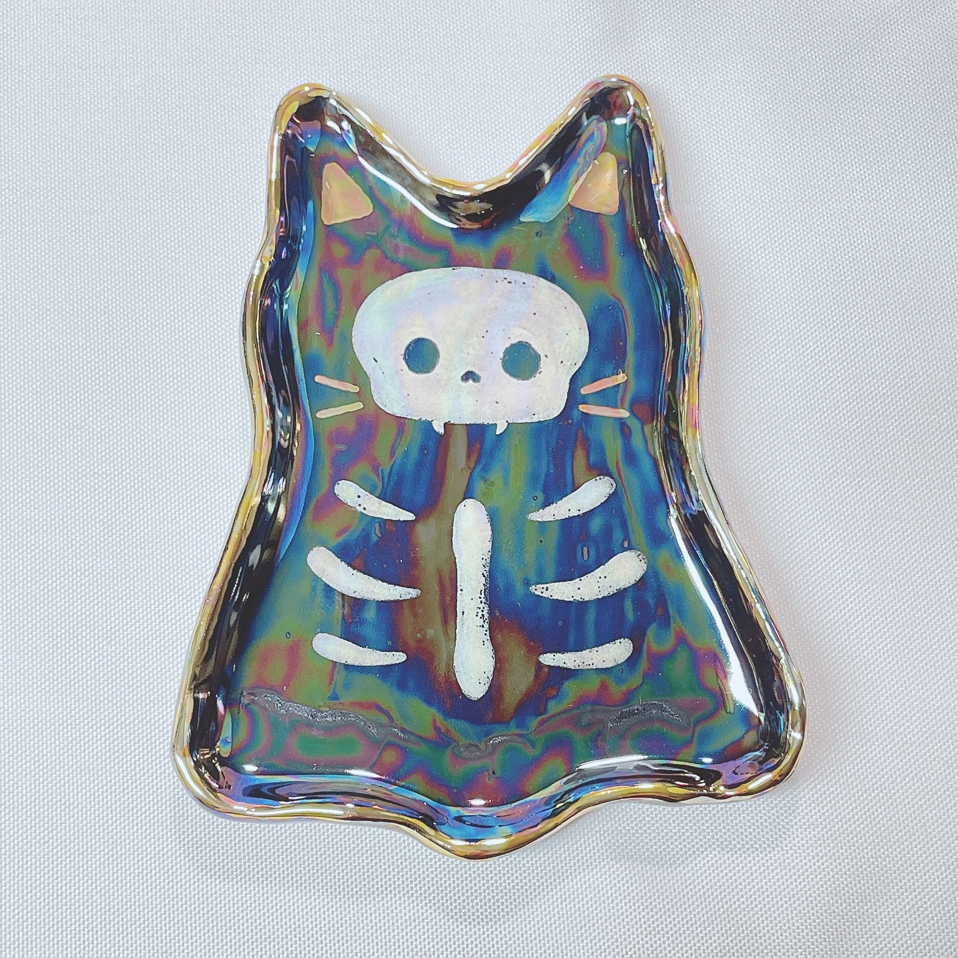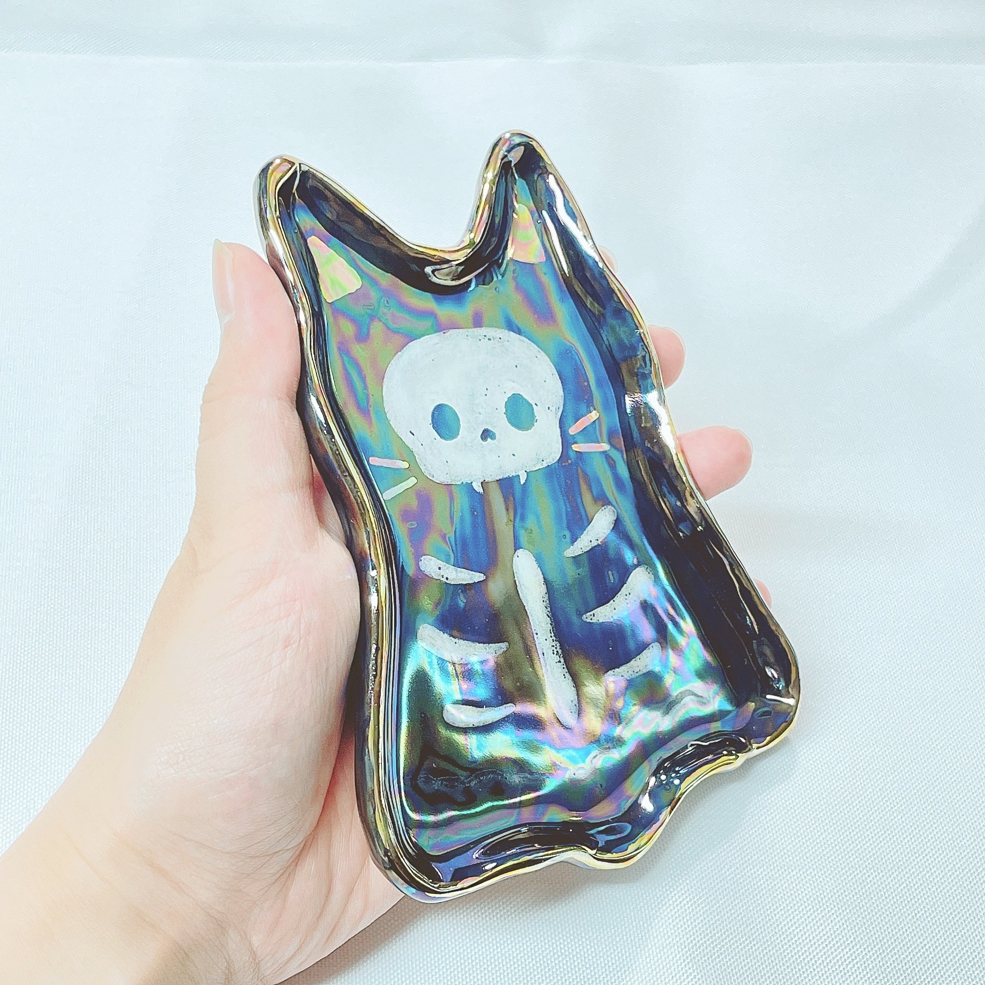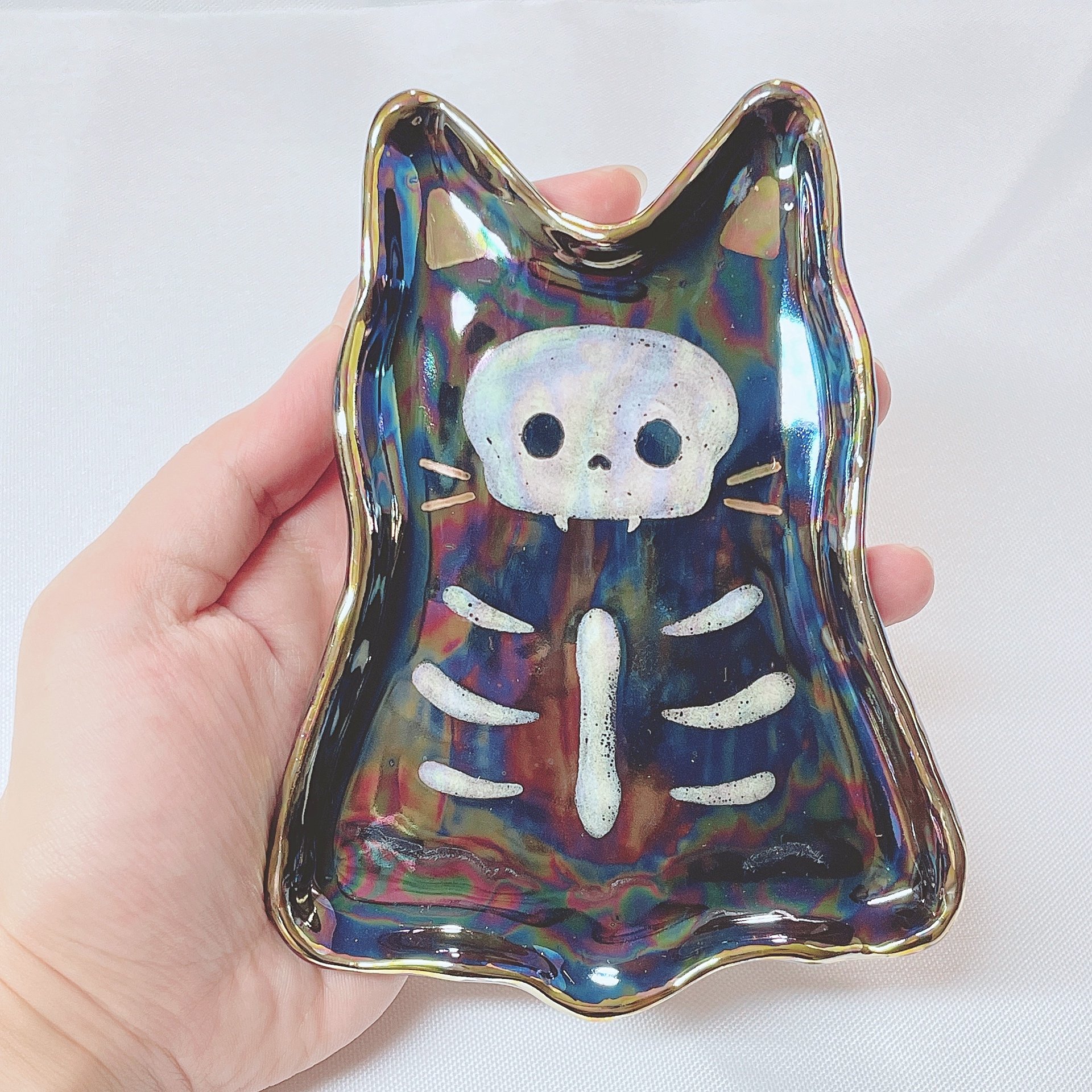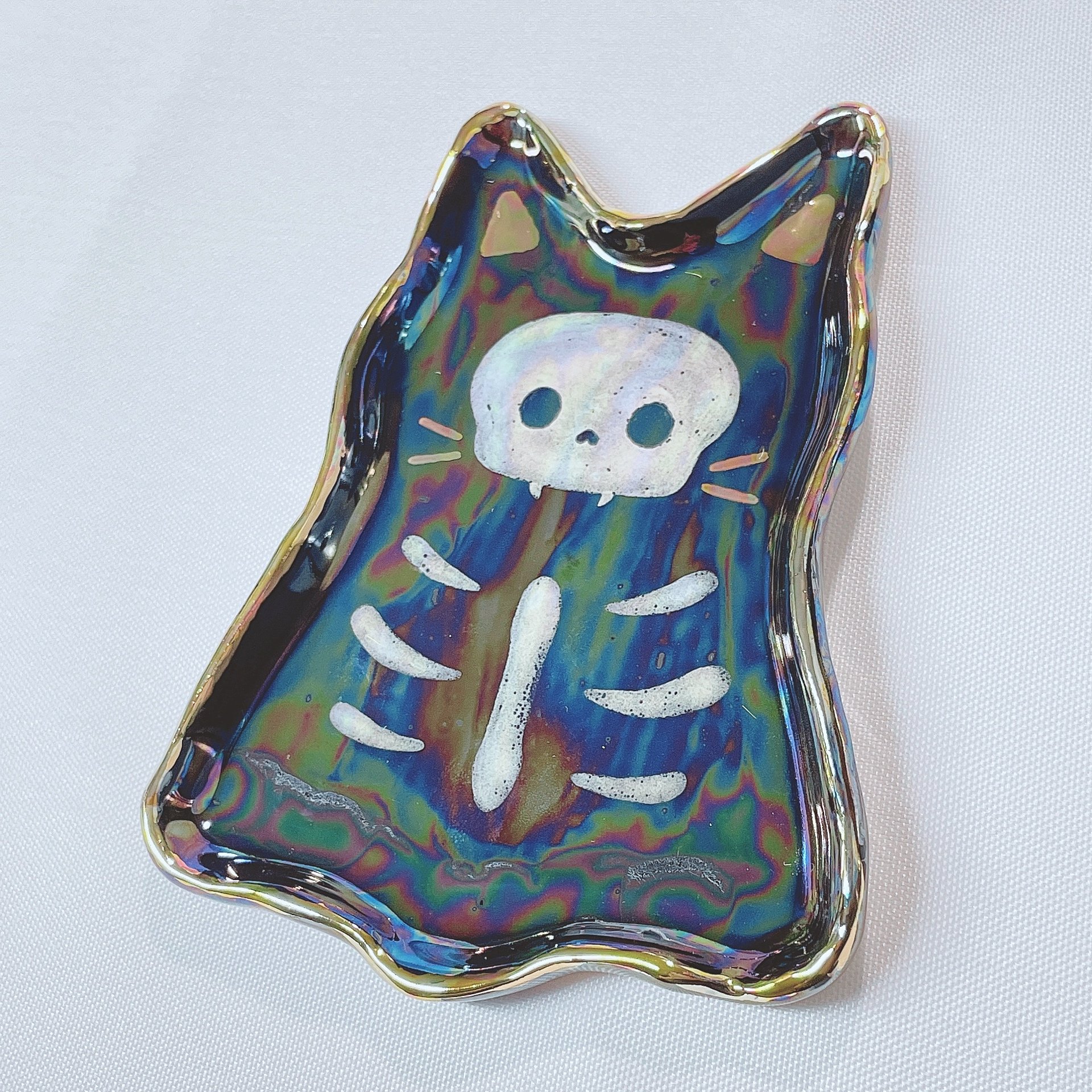 Large skeleton ghost cat trinket dish is made of low fire earthen clay and Duncan underglaze for ceramic. This large dish is about 5.4 inches in length or 13.5 cm. In order to achieve the final looking pieces, I put a lot of time and care into sculpting, glazing, and firing my pieces at the right temperature. Delicate 22k gold details are painted by hand in these pieces for elegant and shiny looking. This dish also has rainbow effect.