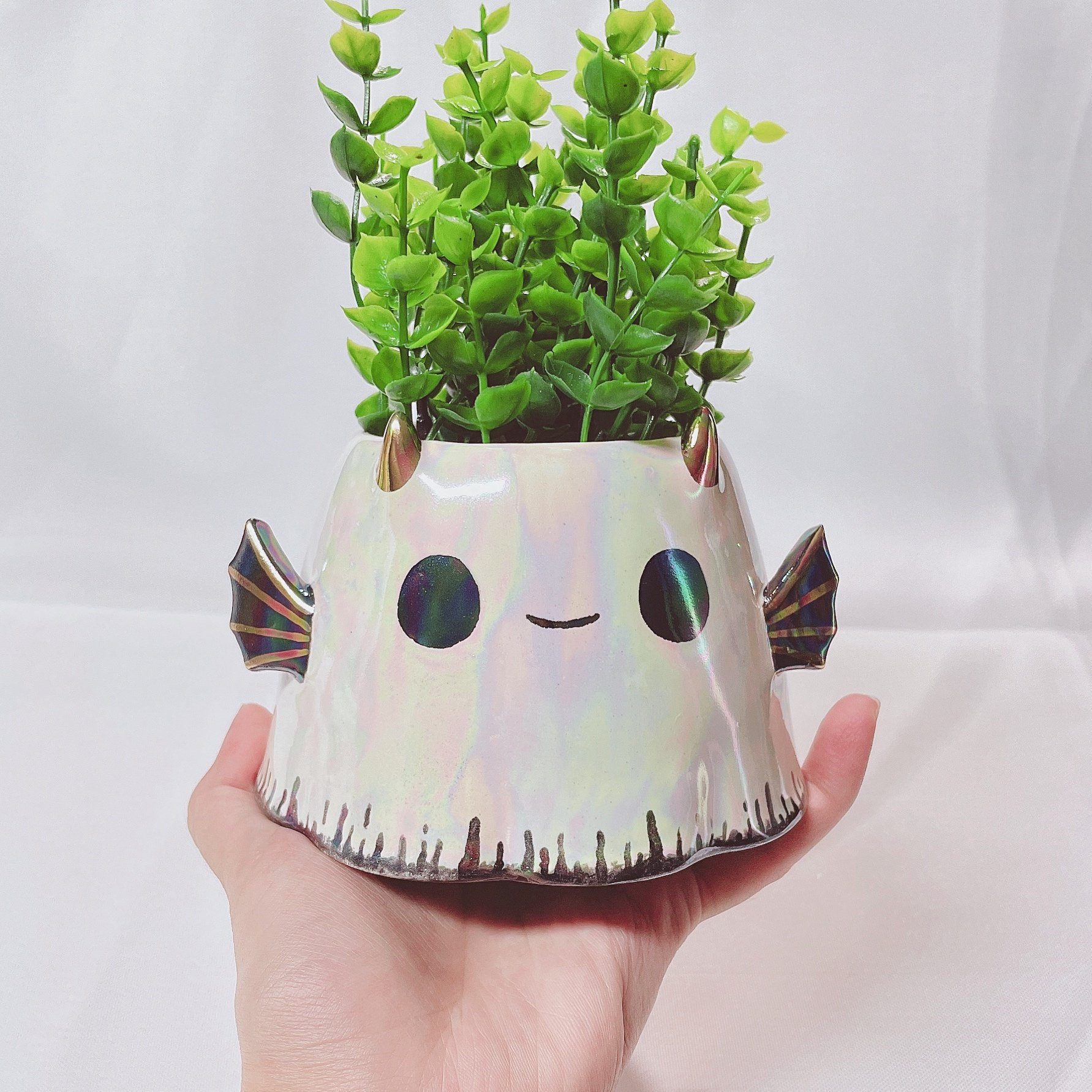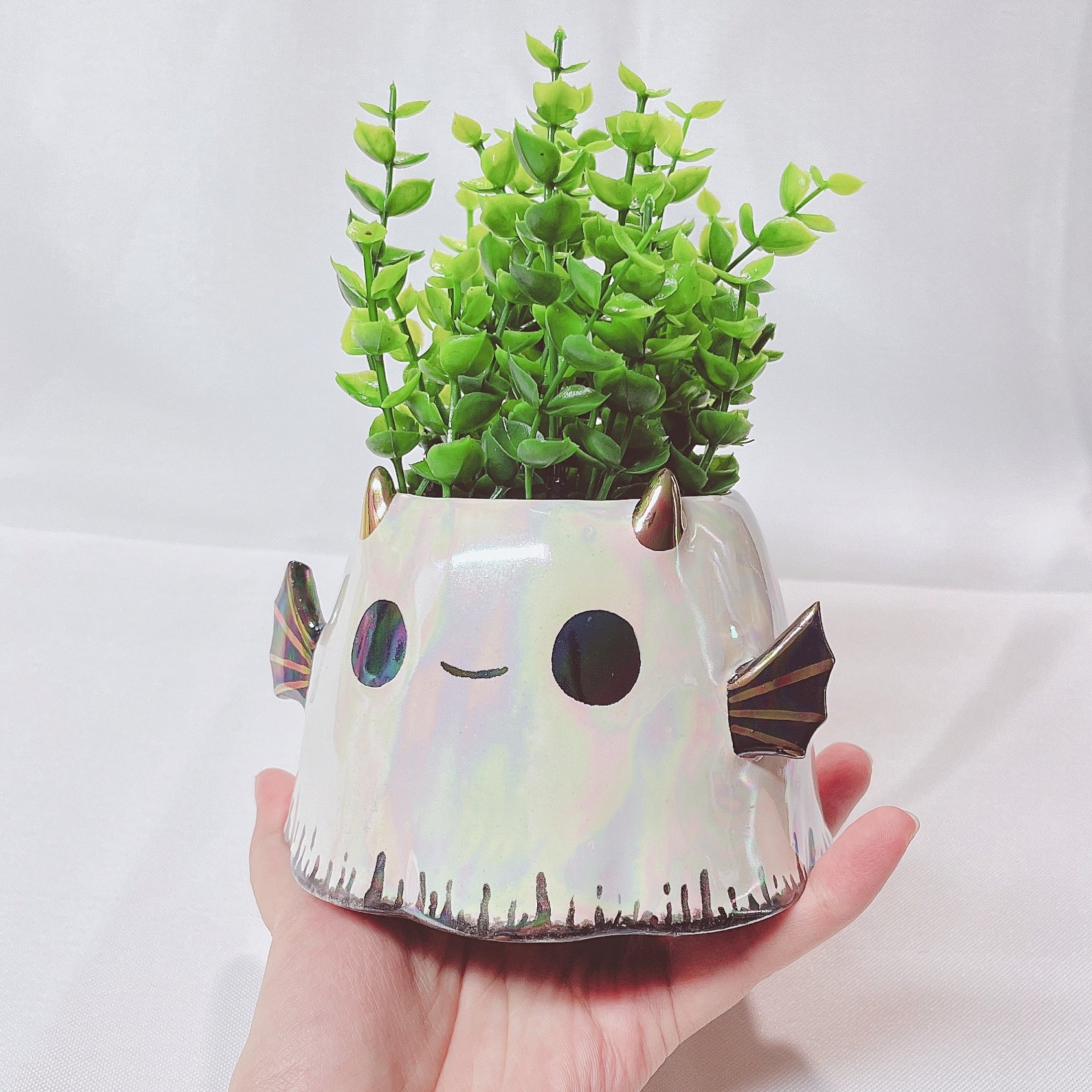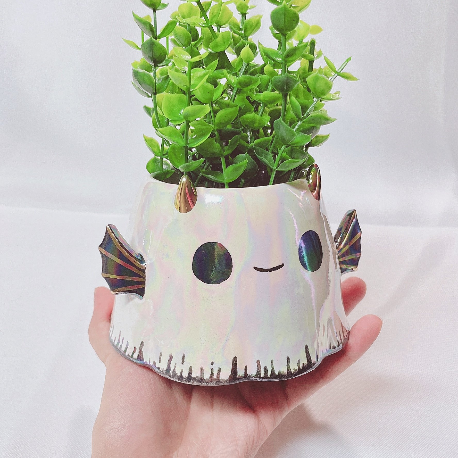 Ghost small planter is made of low fire earthen clay and Duncan underglaze for ceramic. In order to achieve the final looking pieces, I put a lot of time and care into sculpting, glazing, and firing my pieces at the right temperature. Delicate 22k gold details are painted by hand in these pieces for elegant and shiny looking. This ghost planter also has rainbow effect. Please handle them with care.