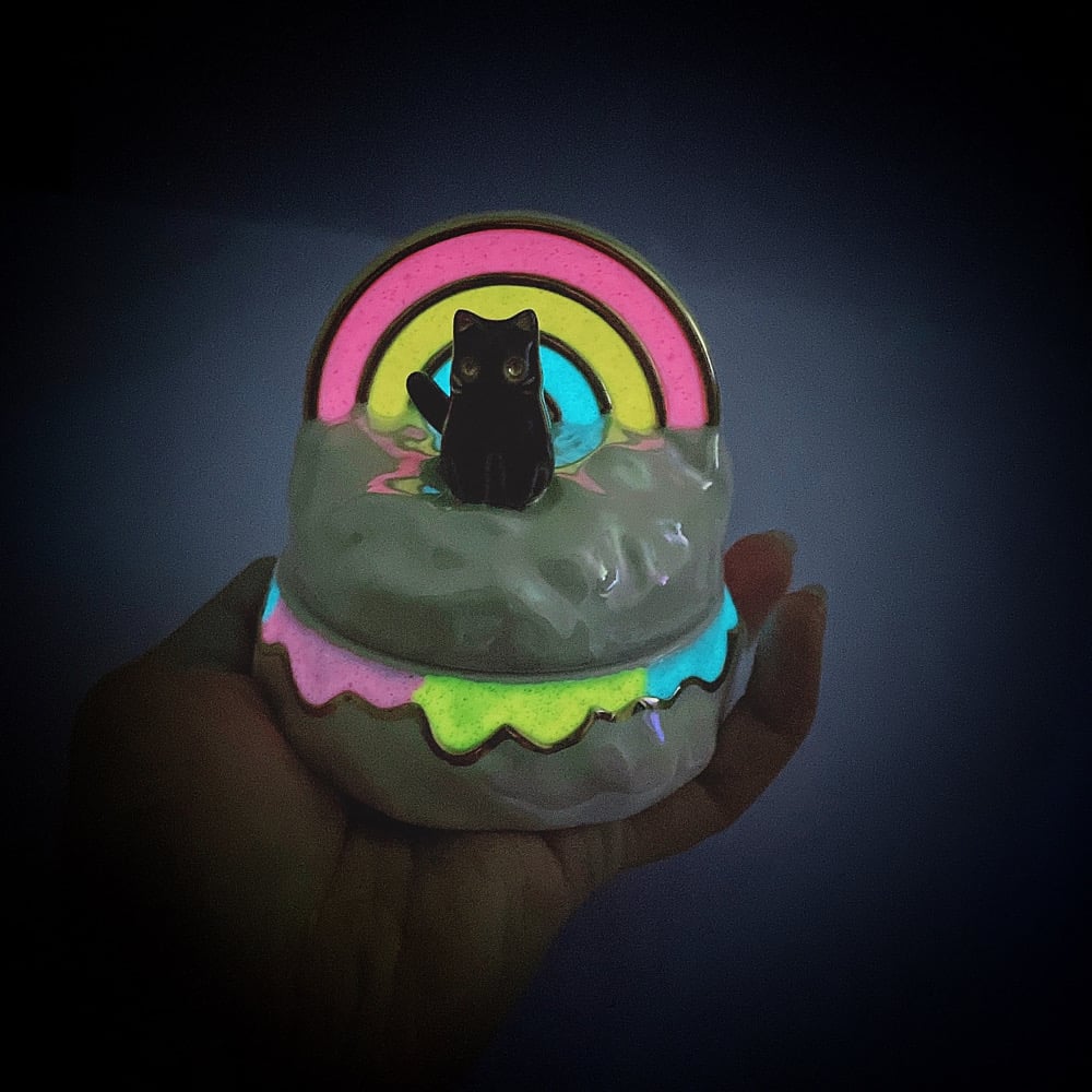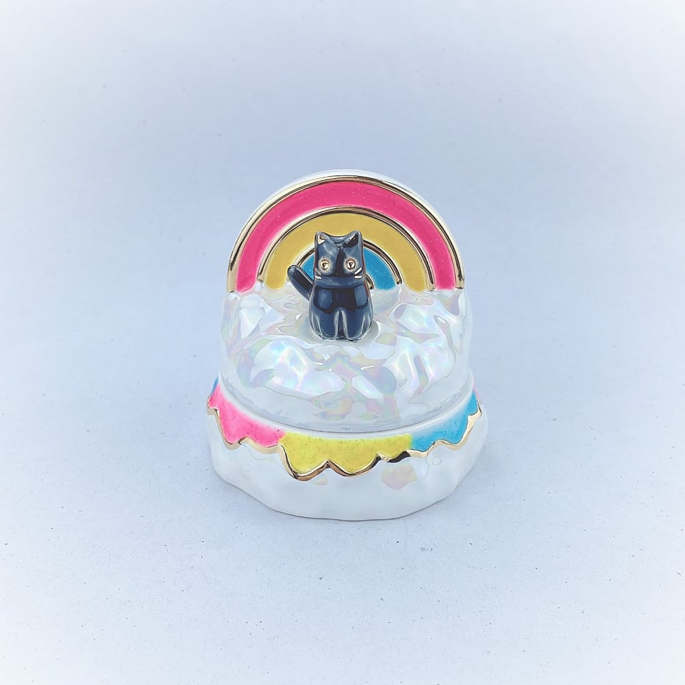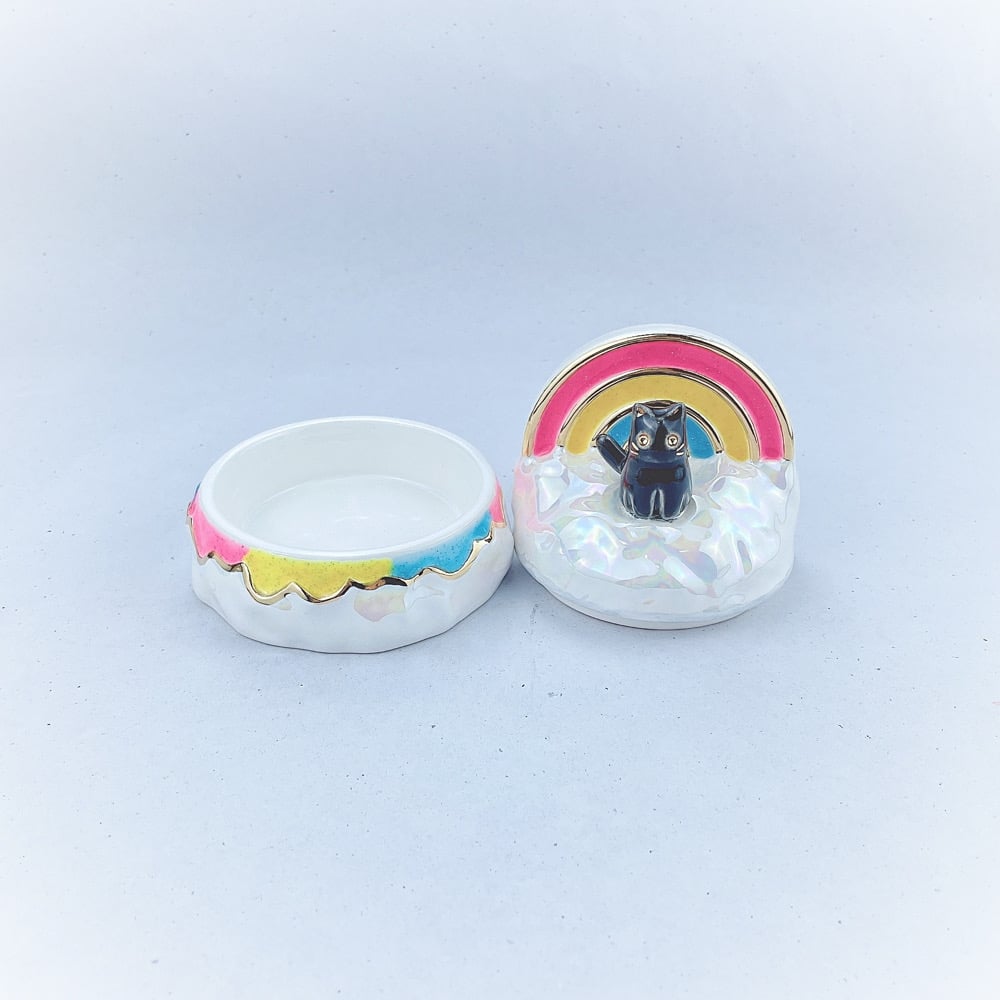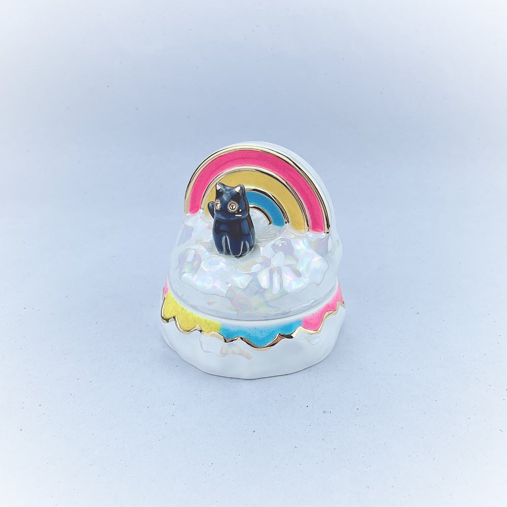 Black cat sitting on glow in dark rainbow and holographic cloud jewelry box is made of low fire earthen clay and Duncan underglaze for ceramic. Recharge glow light everyday under the sun for 40 mins or under UV light for 10 mins. Glow light can hold 15-20 mins each recharge. In order to achieve the final looking pieces, I put a lot of time and care into sculpting, glazing, and firing my pieces at the right temperature. Delicate 22k gold details are painted by hand in these pieces for elegant and shiny looking. This jewelry box also has holographic effect on the cloud. Please handle them with care.