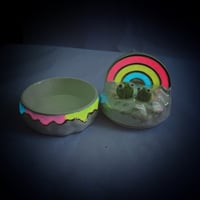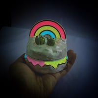 Happy frogs sitting on glow in dark rainbow and holographic cloud jewelry box is made of low fire earthen clay and Duncan underglaze for ceramic. Recharge glow light everyday under the sun for 40 mins or under UV light for 10 mins. Glow light can hold 15-20 mins each recharge. In order to achieve the final looking pieces, I put a lot of time and care into sculpting, glazing, and firing my pieces at the right temperature. Delicate 22k gold details are painted by hand in these pieces for elegant and shiny looking. This jewelry box also has holographic effect on the cloud. Please handle them with care.