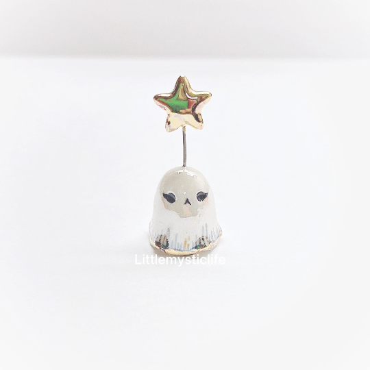 star ghost ceramic figurine is made of low fire earthen clay and Duncan underglaze for ceramic. In order to achieve the final looking pieces, I put a lot of time and care into sculpting, glazing, and firing my pieces at the right temperature. Delicate 22k gold details are painted by hand in these pieces for elegant and shiny looking. All my pieces are very small (about as big as your thumb), please handle them with care.