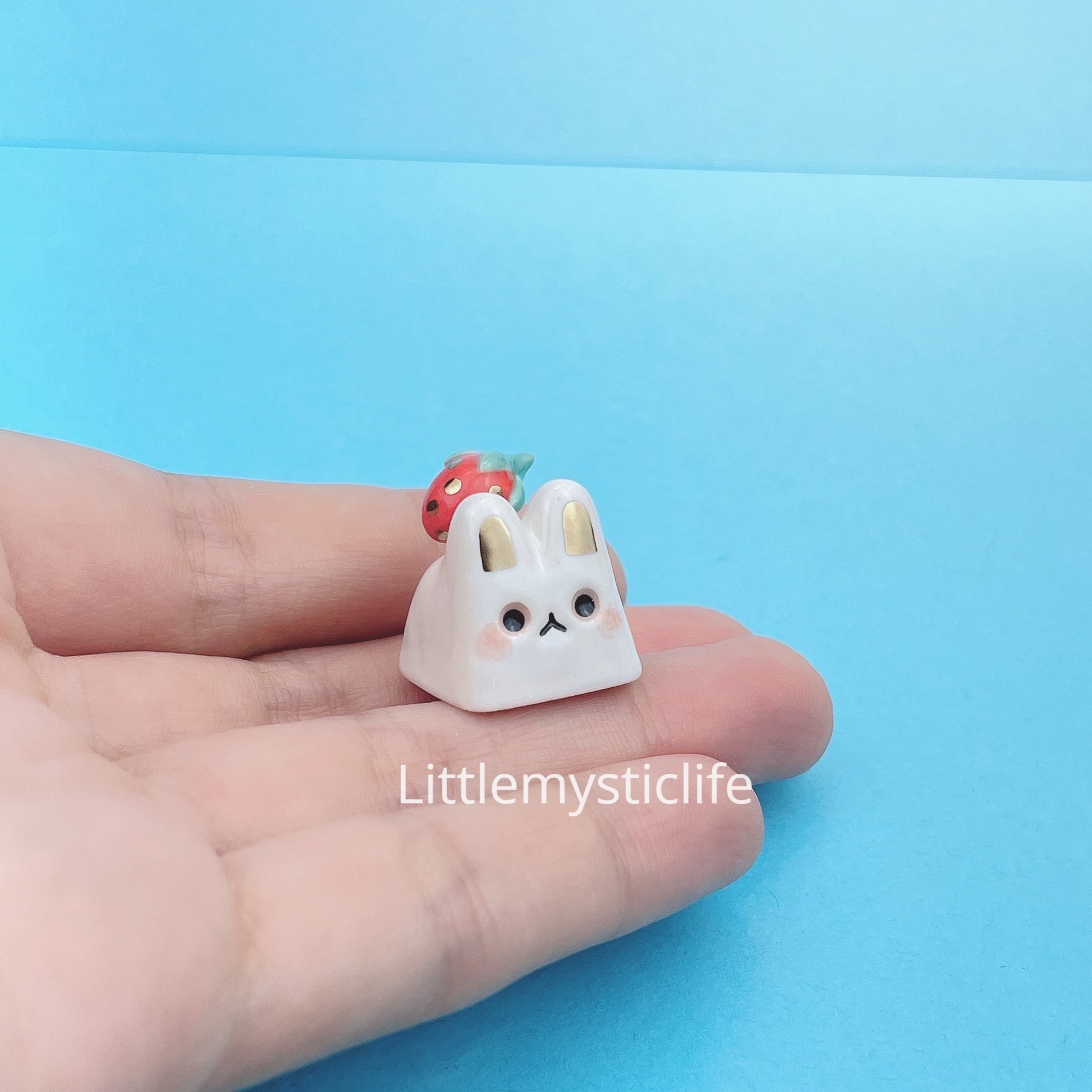 Keycap strawberry bunny is made of low fire earthen clay and Duncan underglaze for ceramic. In order to achieve the final looking pieces, I put a lot of time and care into sculpting, glazing, and firing my pieces at the right temperature. Delicate 22k gold details are painted by hand in these pieces for elegant and shiny looking. All my pieces are very small (about as big as your thumb), please handle them with care.