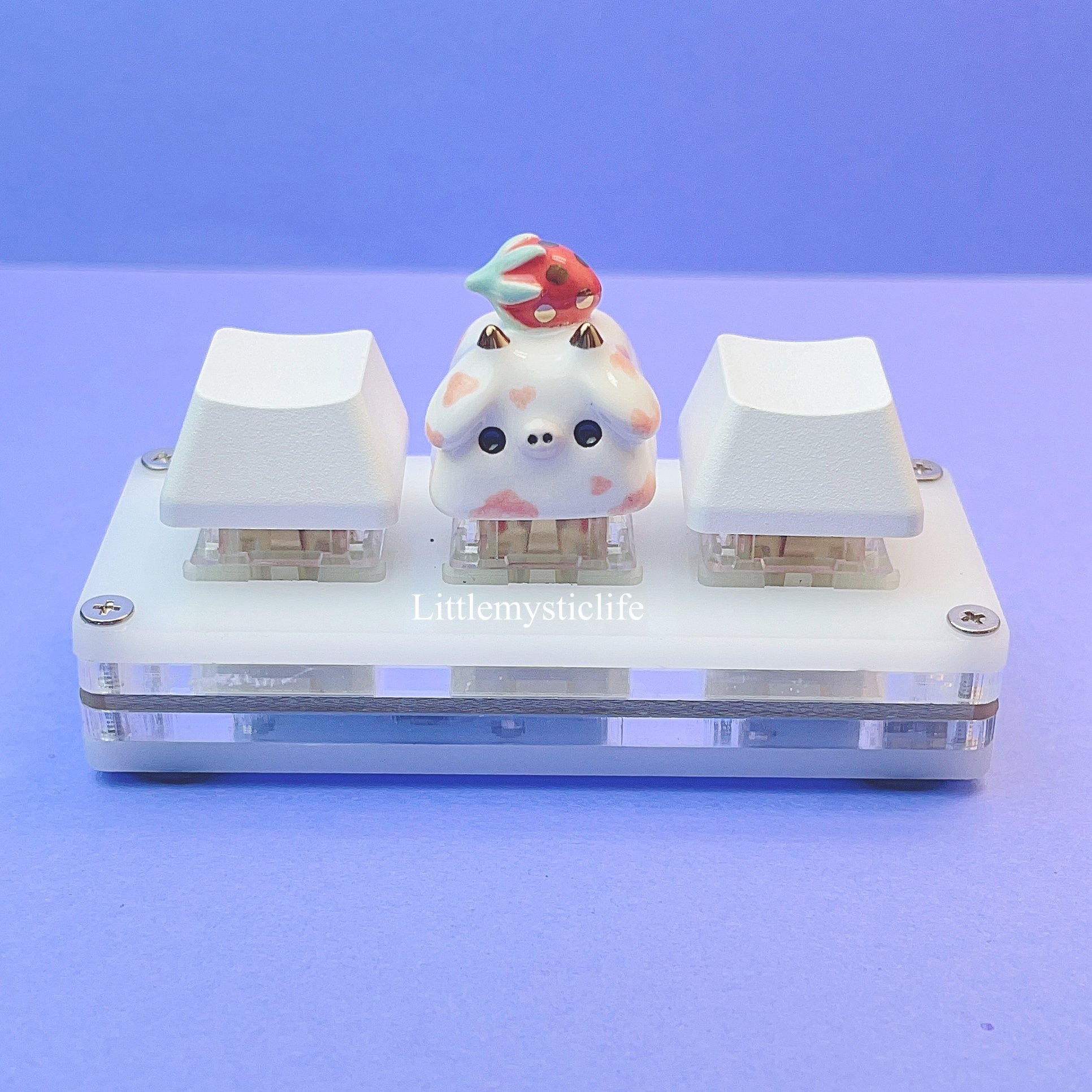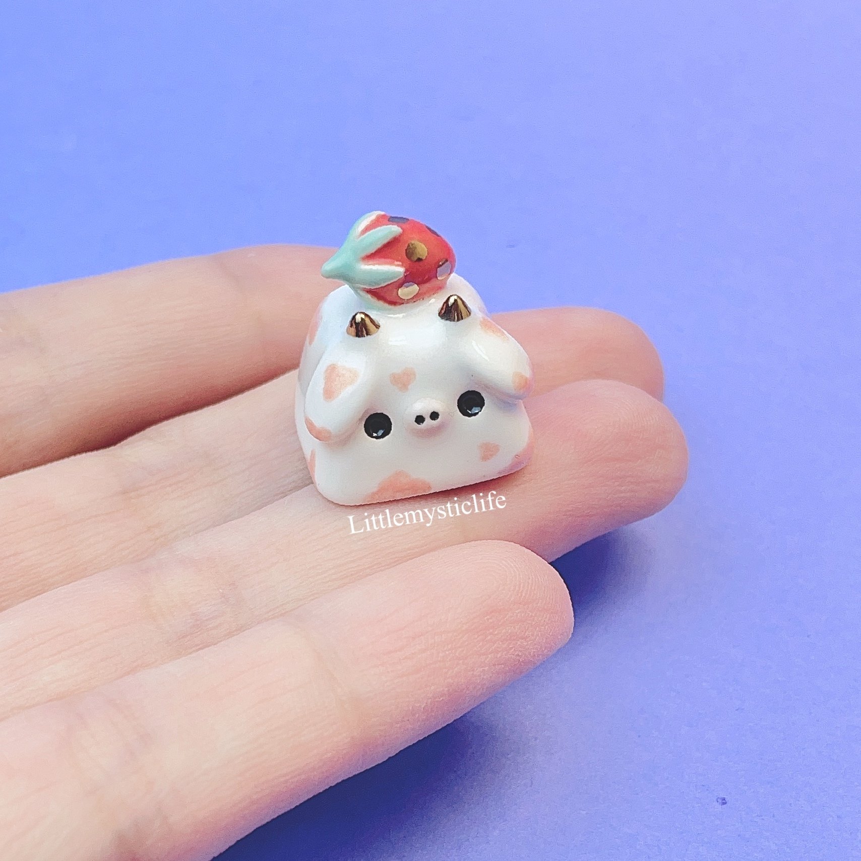 Keycap strawberry cow is made of low fire earthen clay and Duncan underglaze for ceramic. In order to achieve the final looking pieces, I put a lot of time and care into sculpting, glazing, and firing my pieces at the right temperature. Delicate 22k gold details are painted by hand in these pieces for elegant and shiny looking. All my pieces are very small (about as big as your thumb), please handle them with care.