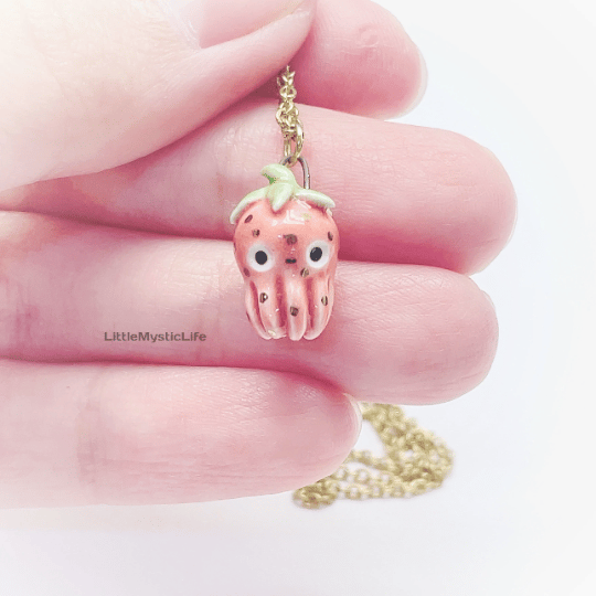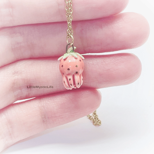 _Strawberry octopus ceramic necklace is made of low fire earthen clay and Duncan underglaze for ceramic. In order to achieve the final looking pieces, I put a lot of time and care into sculpting, glazing, and firing my pieces at the right temperature. Delicate 22k gold details are painted by hand in these pieces for elegant and shiny looking. All my pieces are very small (about as big as your thumb), please handle them with care and I recommend to take off your necklace while sleeping and showering.
