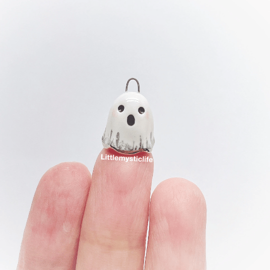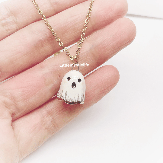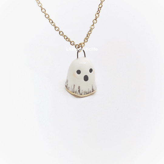 _ Surprise ghost ceramic necklace is made of low fire earthen clay and Duncan underglaze for ceramic. In order to achieve the final looking pieces, I put a lot of time and care into sculpting, glazing, and firing my pieces at the right temperature. Delicate 22k gold details are painted by hand in these pieces for elegant and shiny looking. All my pieces are very small (about as big as your thumb), please handle them with care and I recommend to take off your necklace while sleeping and showering.