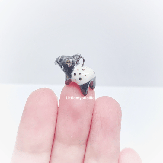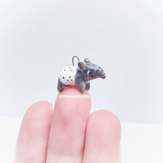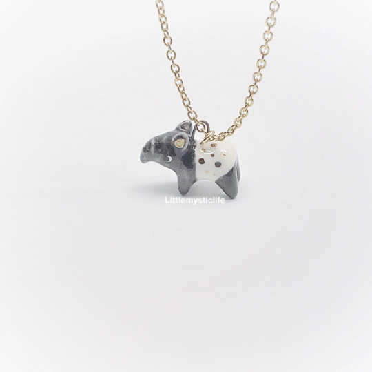 _Tapir ceramic necklace is made of low fire earthen clay and Duncan underglaze for ceramic. In order to achieve the final looking pieces, I put a lot of time and care into sculpting, glazing, and firing my pieces at the right temperature. Delicate 22k gold details are painted by hand in these pieces for elegant and shiny looking. All my pieces are very small (about as big as your thumb), please handle them with care and I recommend to take off your necklace while sleeping and showering.