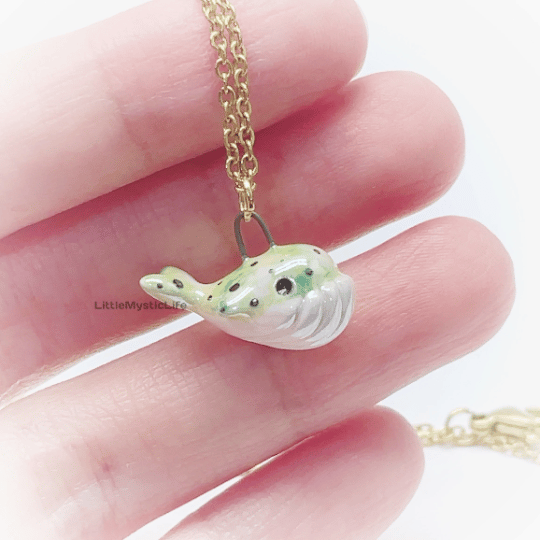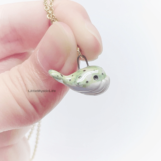 _Tiny whale ceramic necklace is made of low fire earthen clay and Duncan underglaze for ceramic. In order to achieve the final looking pieces, I put a lot of time and care into sculpting, glazing, and firing my pieces at the right temperature. Delicate 22k gold details are painted by hand in these pieces for elegant and shiny looking. All my pieces are very small (about as big as your thumb), please handle them with care and I recommend to take off your necklace while sleeping and showering.