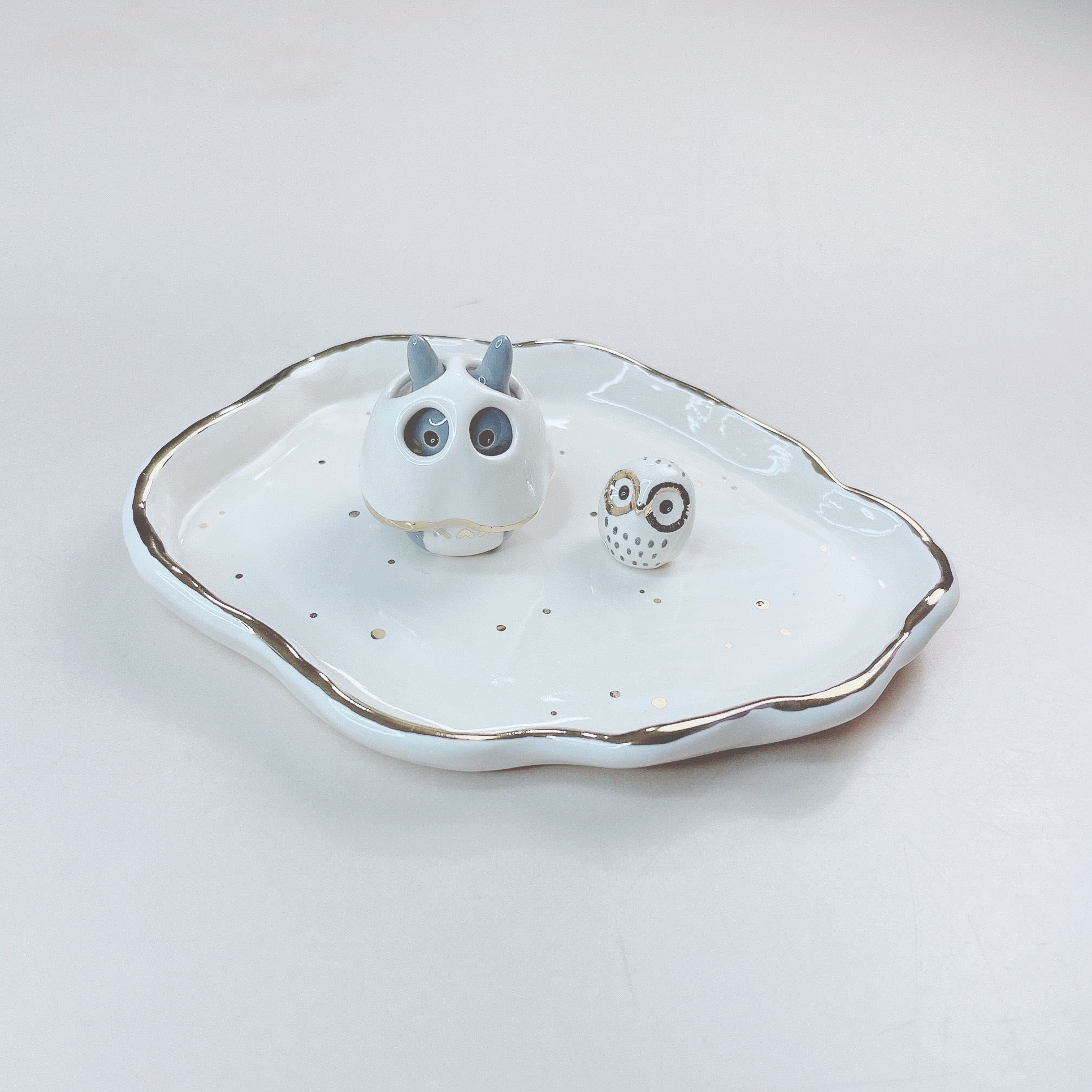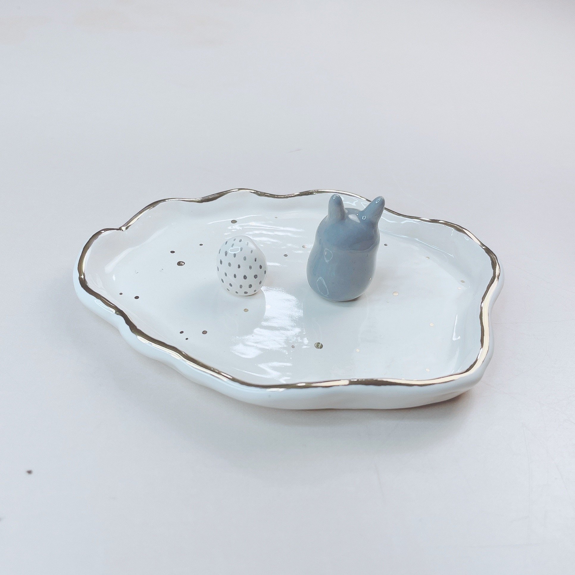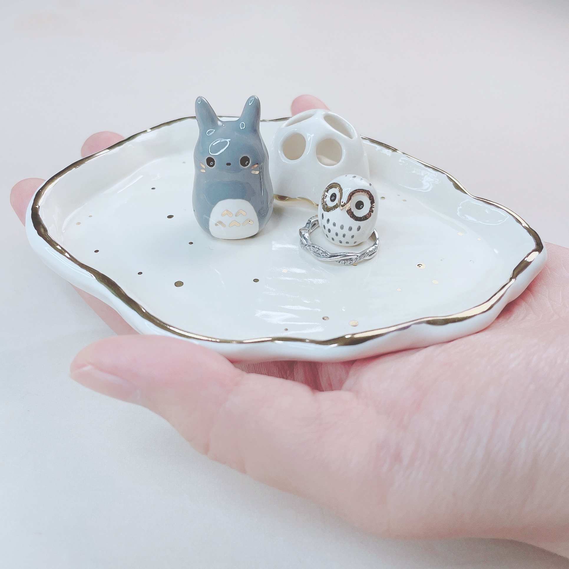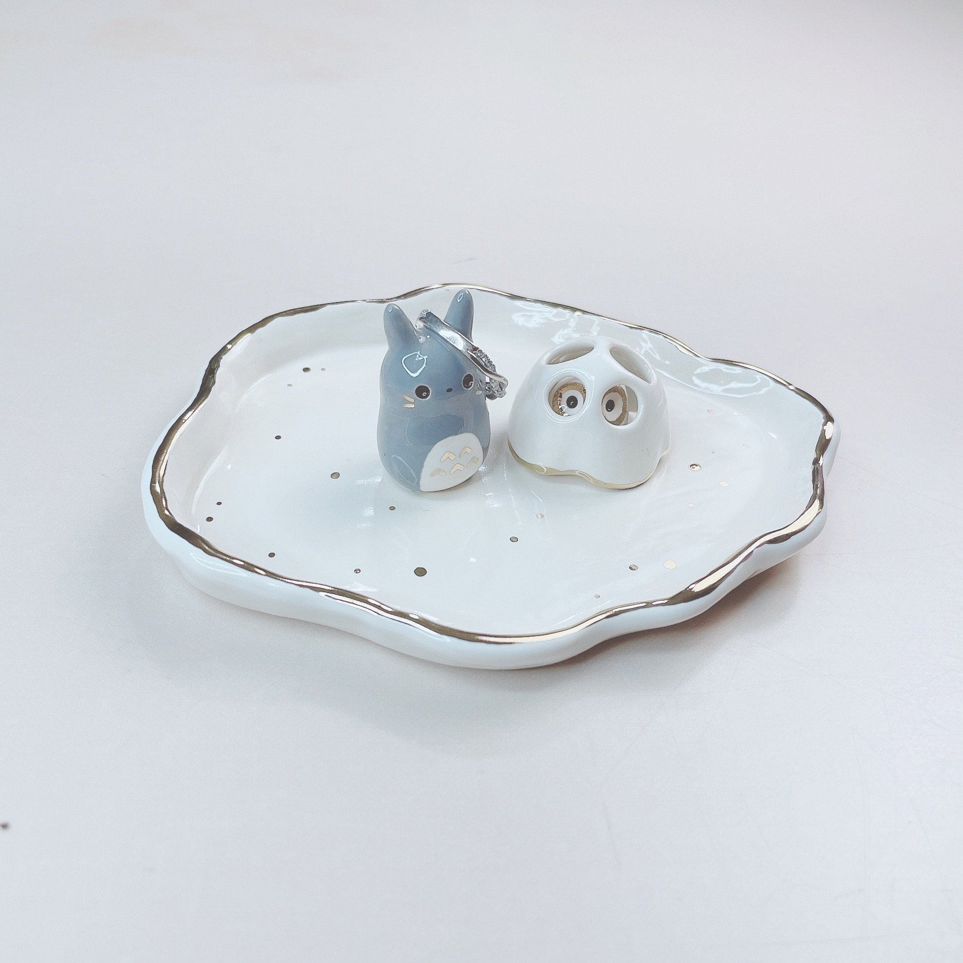 This totoro trinket dish is made of low fire earthen clay and Duncan underglaze for ceramic. This large dish is about 4.2 inches in length. In order to achieve the final looking pieces, I put a lot of time and care into sculpting, glazing, and firing my pieces at the right temperature. Delicate 22k gold details are painted by hand in these pieces for elegant and shiny looking.