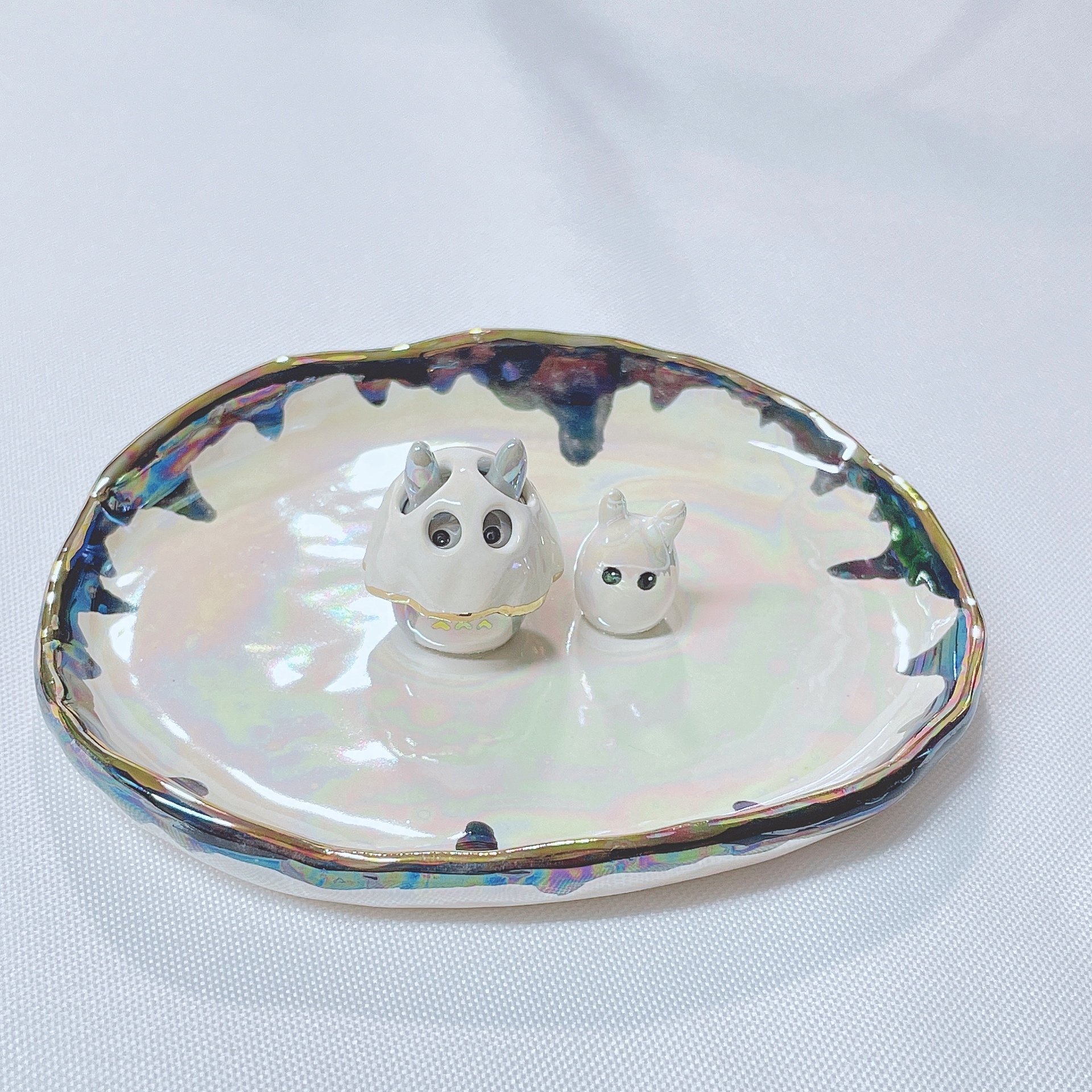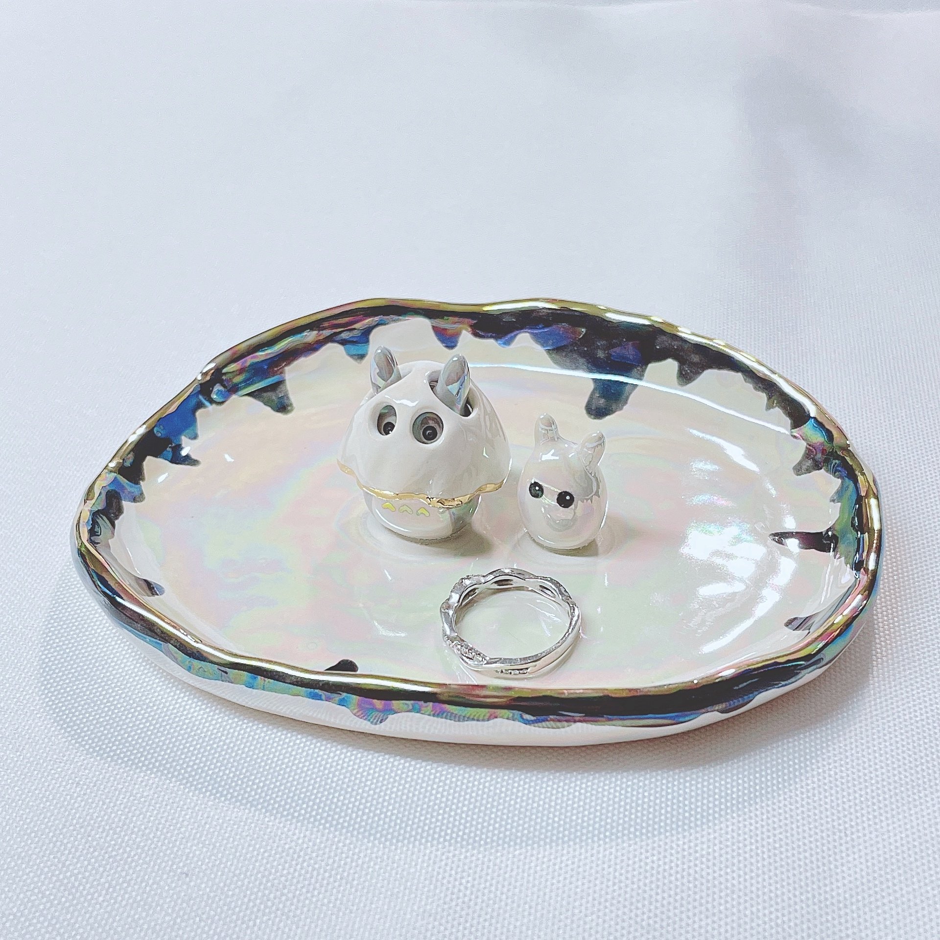 Large skeleton ghost cat trinket dish is made of low fire earthen clay and Duncan underglaze for ceramic. This large dish is about 4.4 inches in length. In order to achieve the final looking pieces, I put a lot of time and care into sculpting, glazing, and firing my pieces at the right temperature. Delicate 22k gold details are painted by hand in these pieces for elegant and shiny looking. This dish also has rainbow effect.
