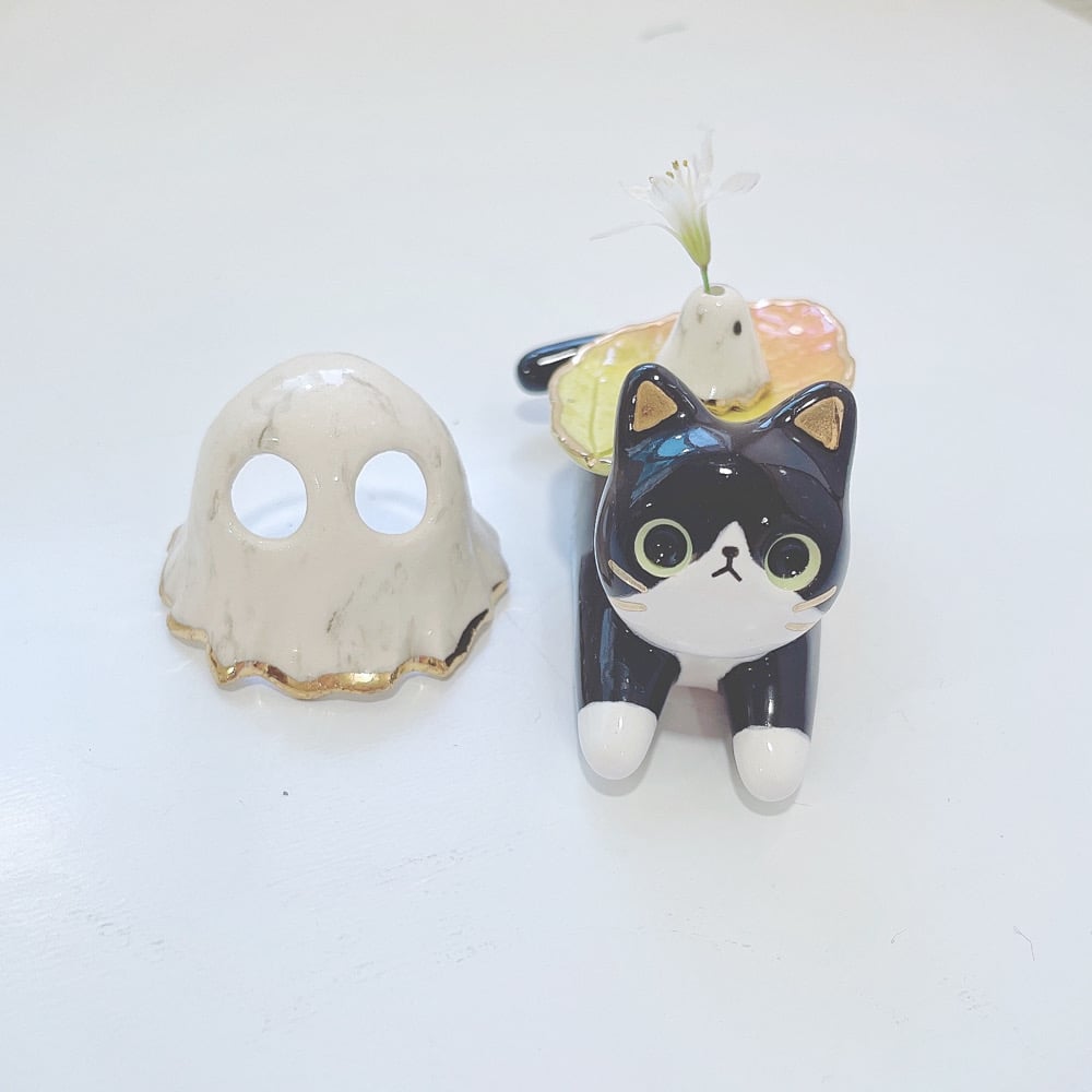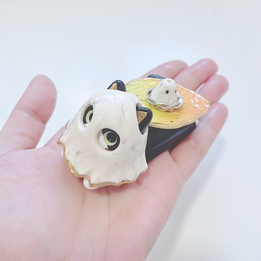 Tuxedo cat glow in dark ghost ring holder ceramic figurine