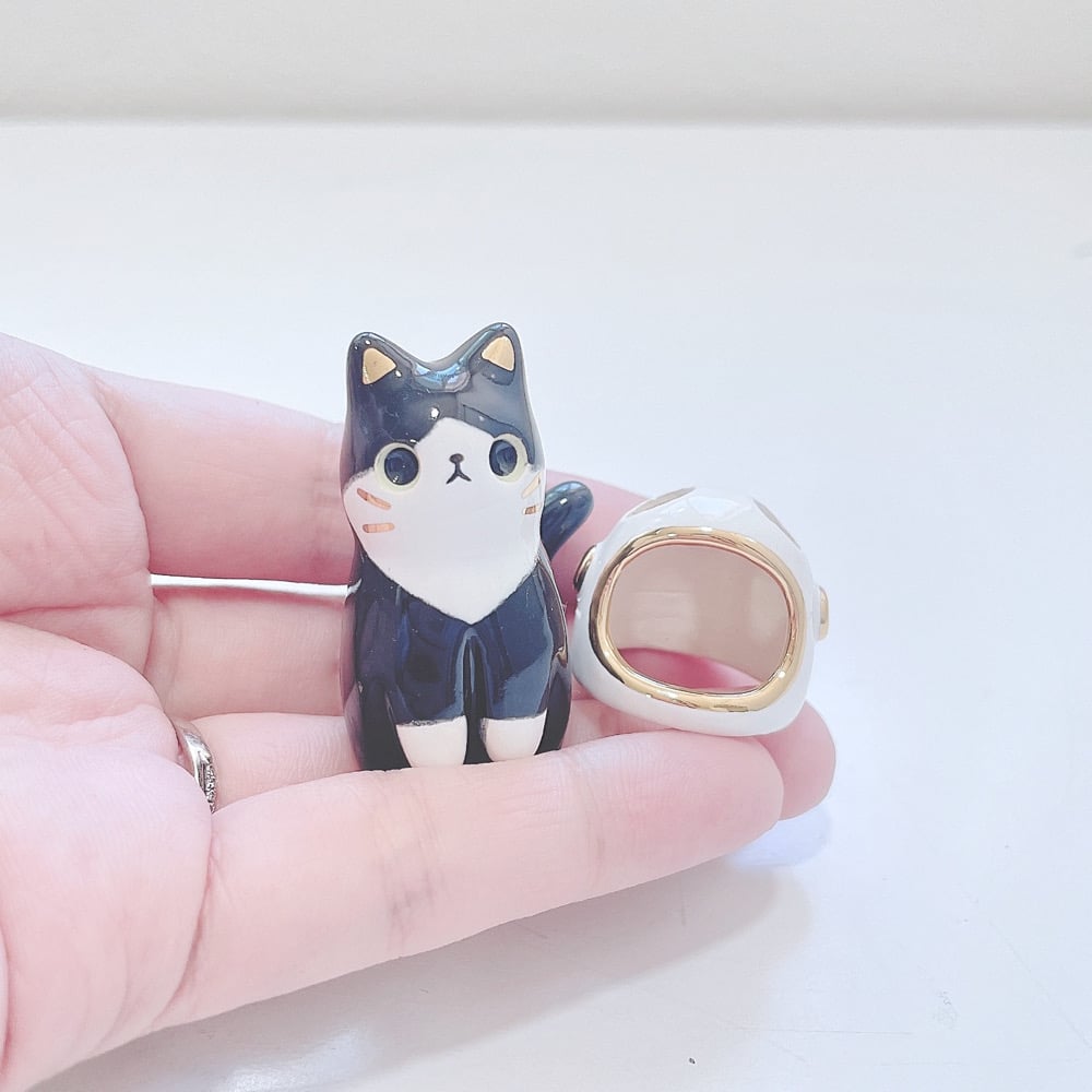 Tuxedo cat with astronaut helmet ceramic figurine is made of low fire earthen clay and Duncan underglaze for ceramic. In order to achieve the final looking pieces, I put a lot of time and care into sculpting, glazing, and firing my pieces at the right temperature. Delicate 22k gold details are painted by hand in these pieces for elegant and shiny looking. Please handle them with care.
