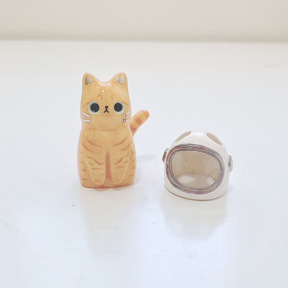 Orange cat with astronaut helmet ceramic figurine is made of low fire earthen clay and Duncan underglaze for ceramic. In order to achieve the final looking pieces, I put a lot of time and care into sculpting, glazing, and firing my pieces at the right temperature. Delicate 22k white gold details are painted by hand in these pieces for elegant and shiny looking. Please handle them with care.