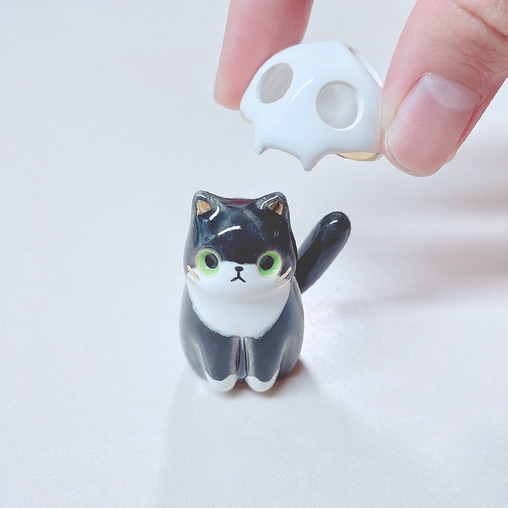 tuxedo cat with skull mask ceramic figurine is made of low fire earthen clay and Duncan underglaze for ceramic. In order to achieve the final looking pieces, I put a lot of time and care into sculpting, glazing, and firing my pieces at the right temperature. Delicate 22k gold details are painted by hand in these pieces for elegant and shiny looking. Please handle them with care.