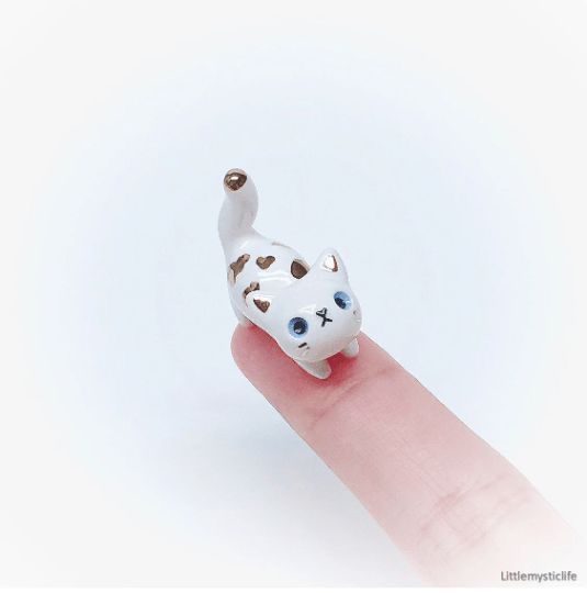 Cat ceramic figurine is made of low fire earthen clay and Duncan underglaze for ceramic. In order to achieve the final looking pieces, I put a lot of time and care into sculpting, glazing, and firing my pieces at the right temperature. Delicate 22k gold details are painted by hand in these pieces for elegant and shiny looking. All my pieces are very small (about as big as your thumb), please handle them with care.