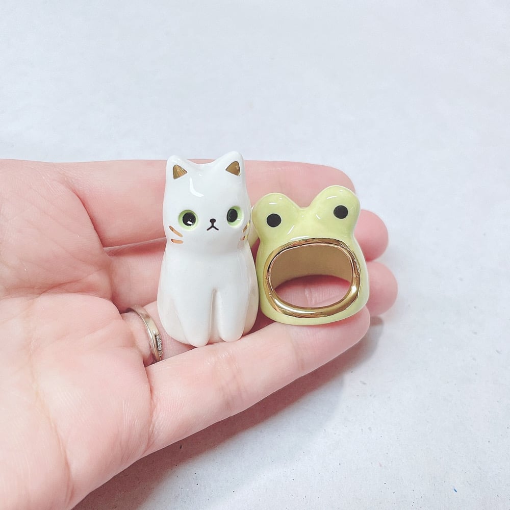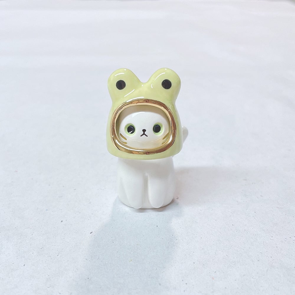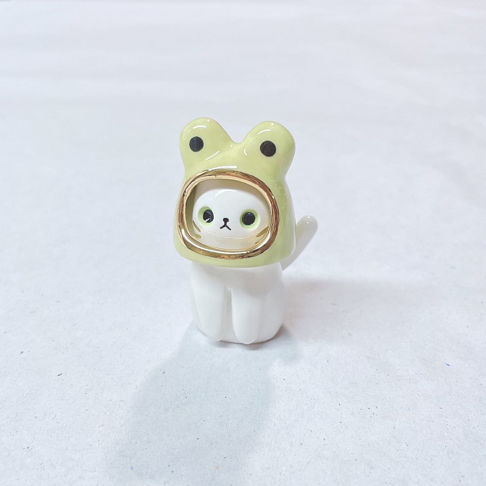 White cat with frog hat ceramic figurine is made of low fire earthen clay and Duncan underglaze for ceramic. In order to achieve the final looking pieces, I put a lot of time and care into sculpting, glazing, and firing my pieces at the right temperature. Delicate 22k gold details are painted by hand in these pieces for elegant and shiny looking. Please handle them with care.