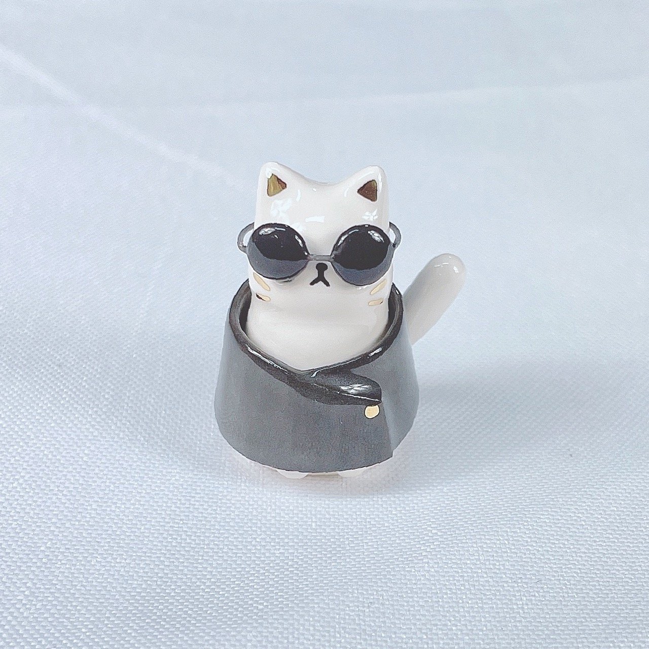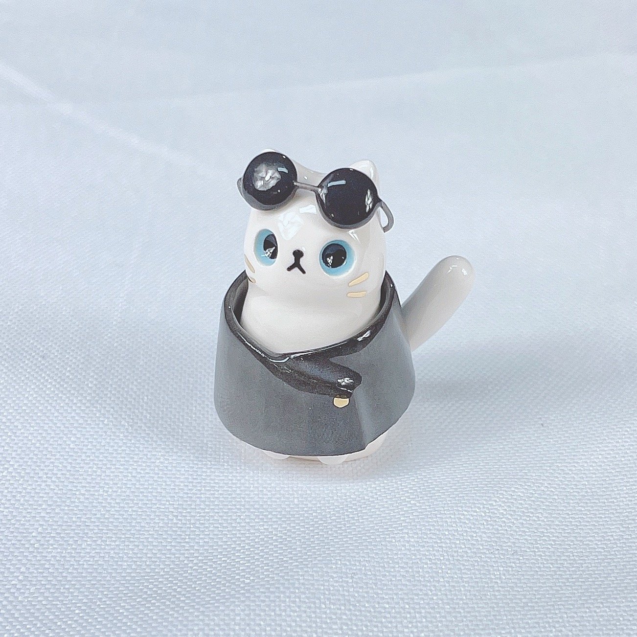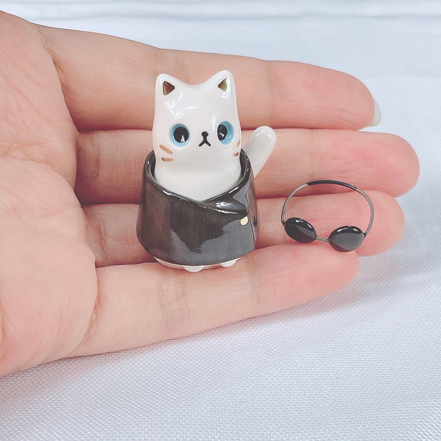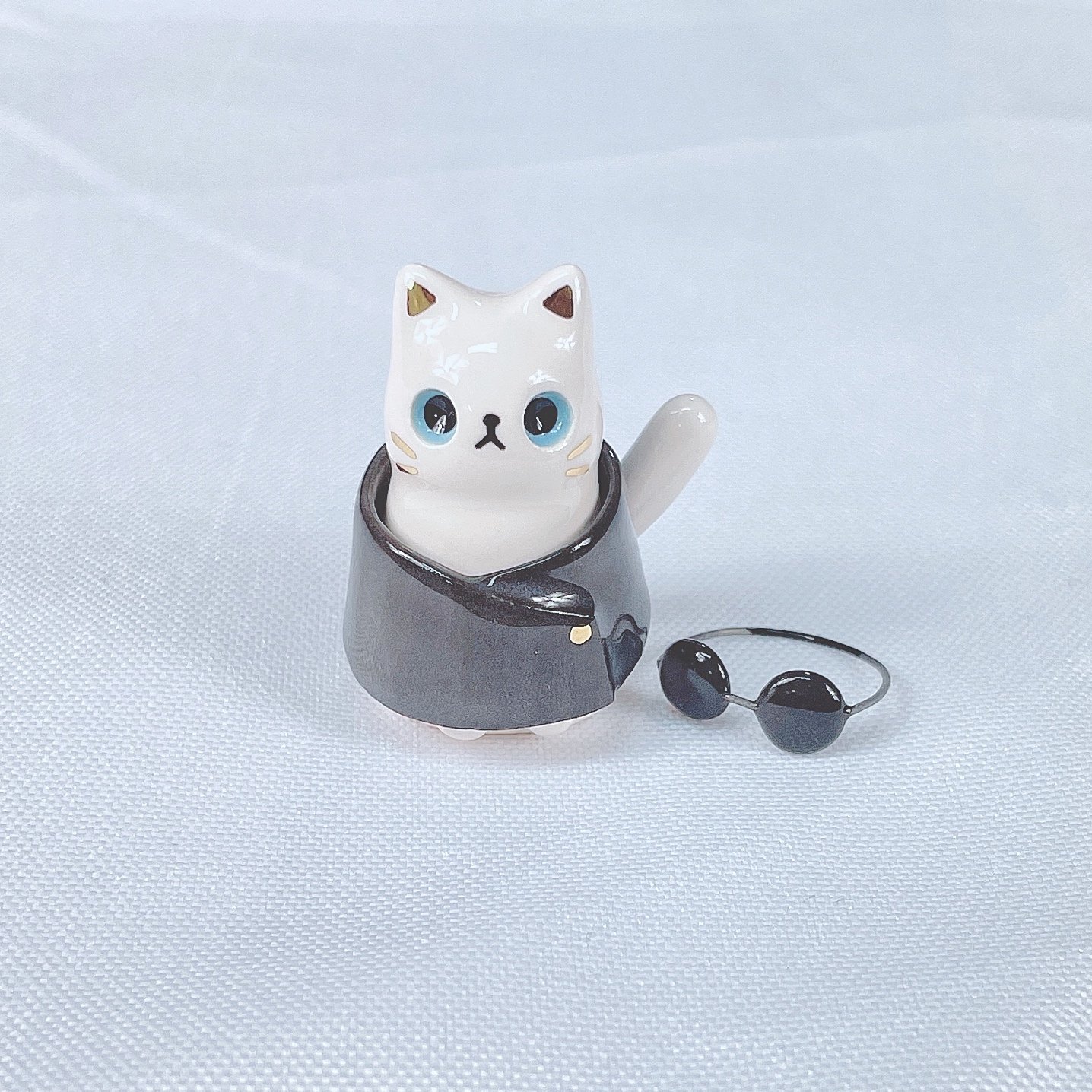 GLASSES ARE FRAGILE PLEASE HANDLE THEM WITH EXTRA CARE. White cat with Gojo outfit ceramic figurine is made of low fire earthen clay and Duncan underglaze for ceramic. In order to achieve the final looking pieces, I put a lot of time and care into sculpting, glazing, and firing my pieces at the right temperature. Delicate 22k gold details are painted by hand in these pieces for elegant and shiny looking. Please handle them with care.