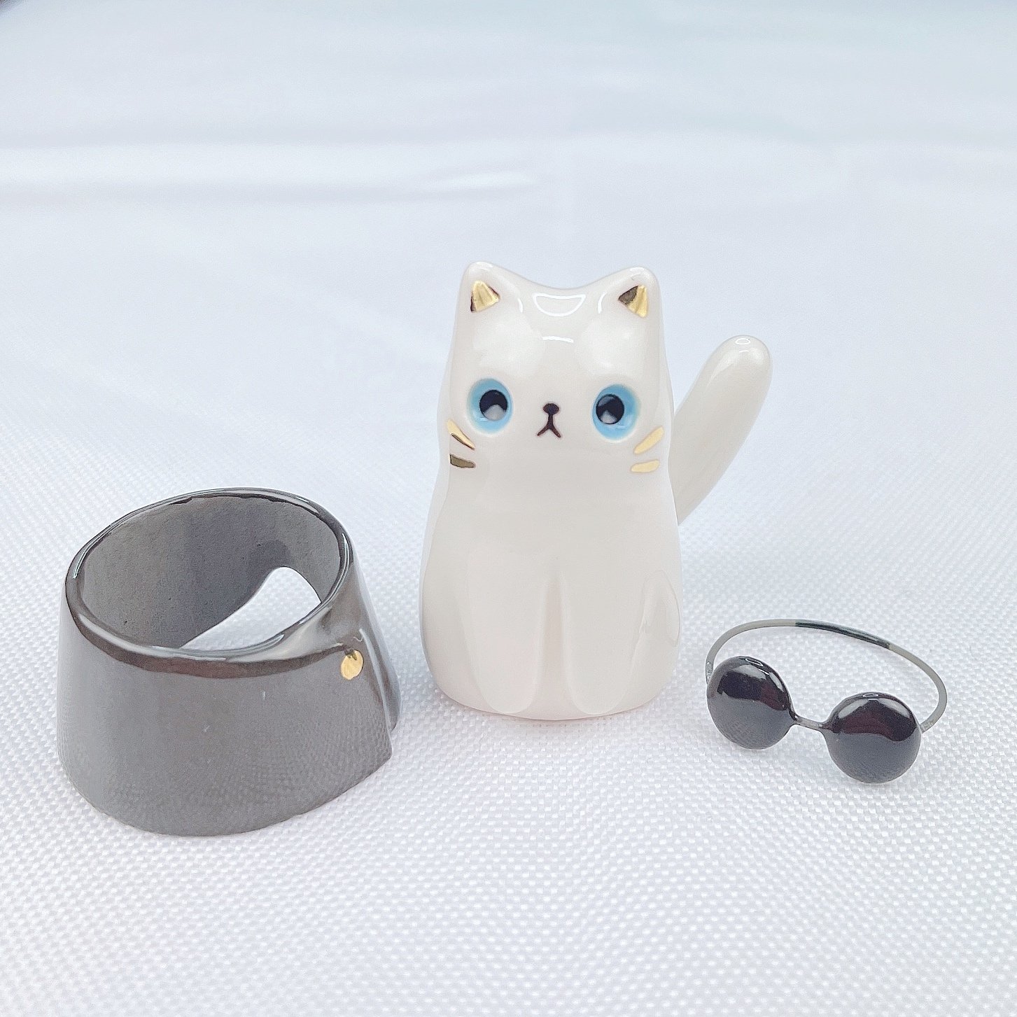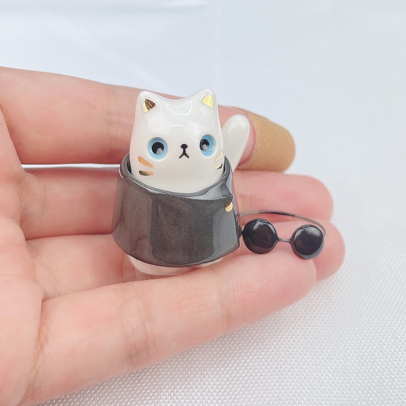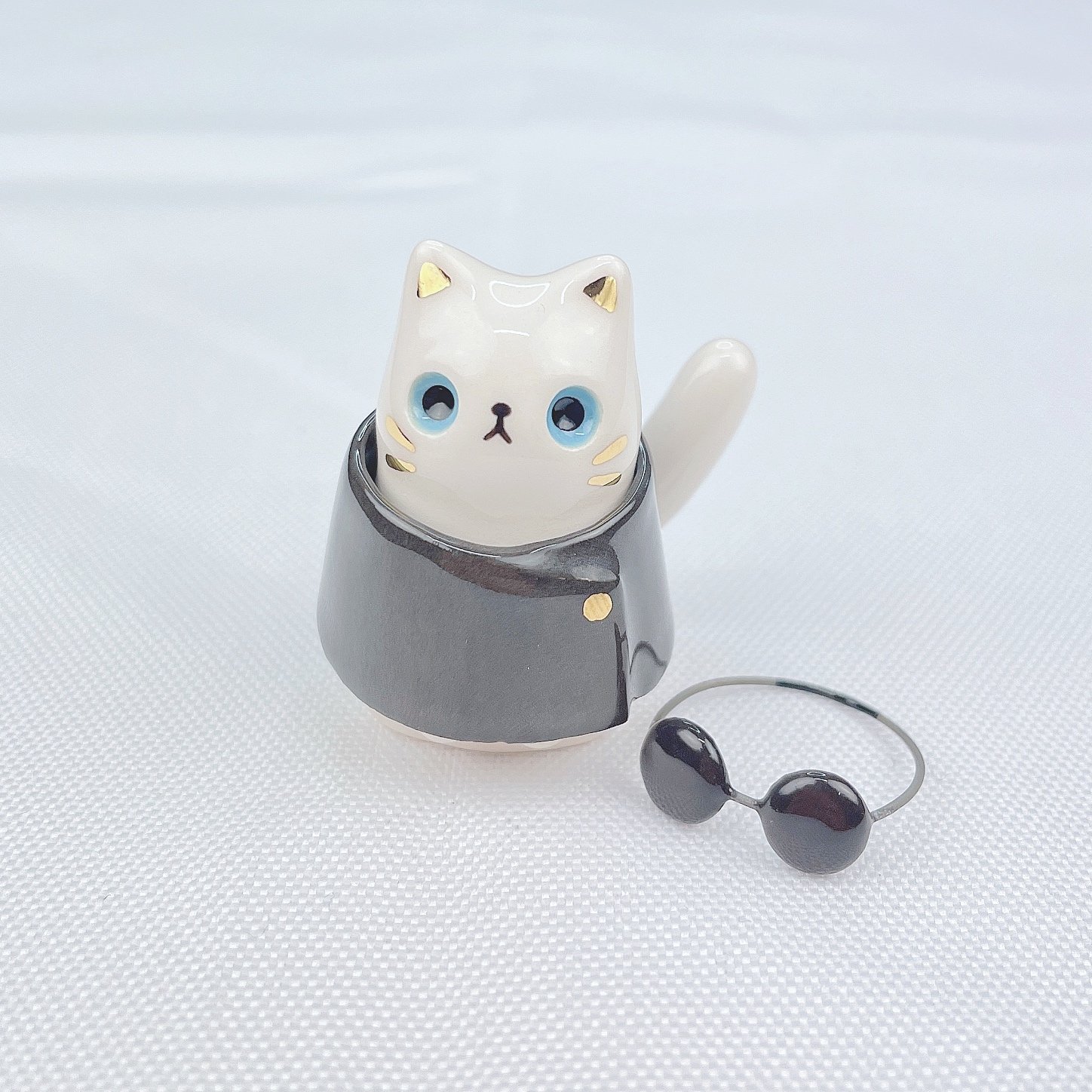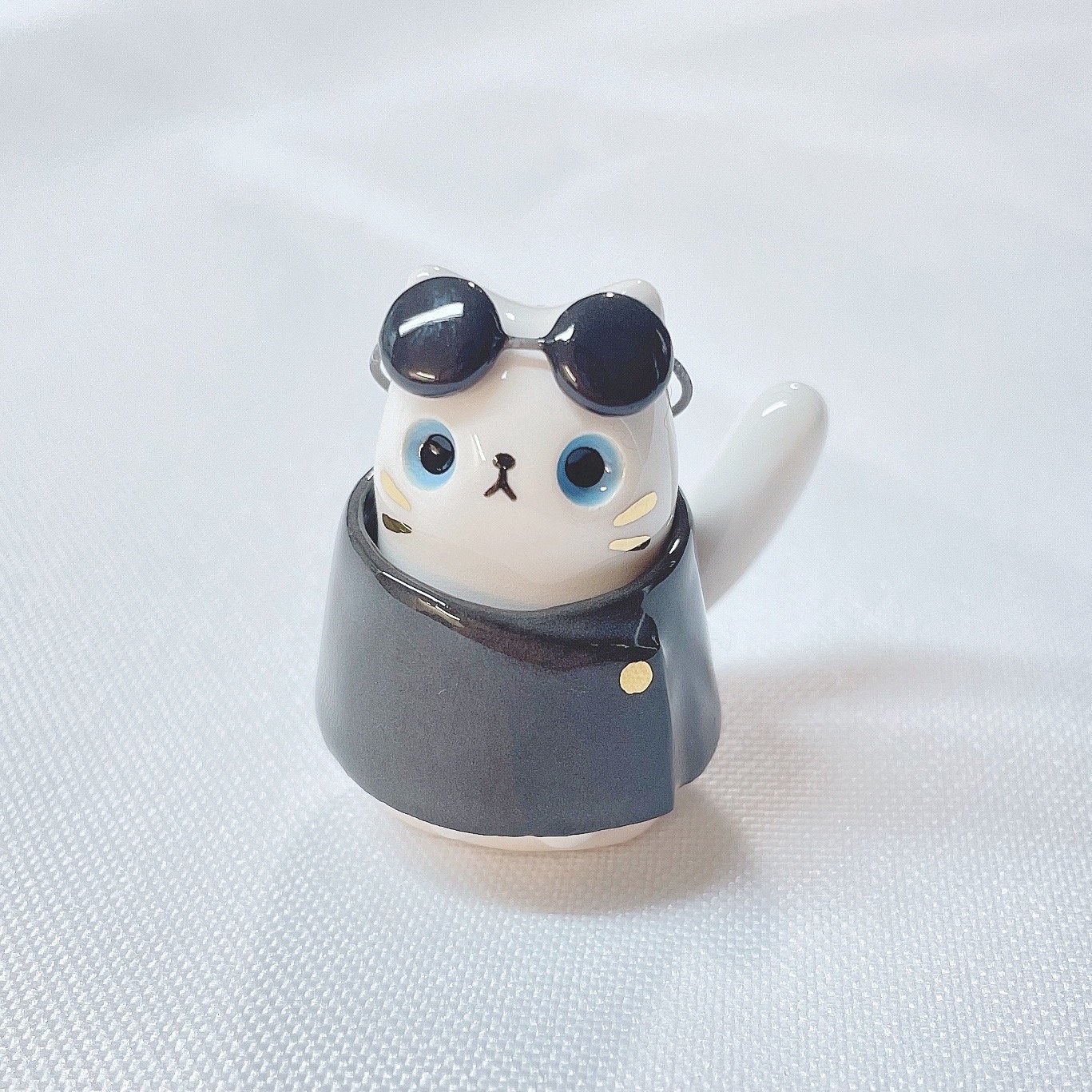 GLASSES ARE FRAGILE PLEASE HANDLE THEM WITH EXTRA CARE. White cat with Gojo outfit ceramic figurine is made of low fire earthen clay and Duncan underglaze for ceramic. In order to achieve the final looking pieces, I put a lot of time and care into sculpting, glazing, and firing my pieces at the right temperature. Delicate 22k gold details are painted by hand in these pieces for elegant and shiny looking. Please handle them with care.