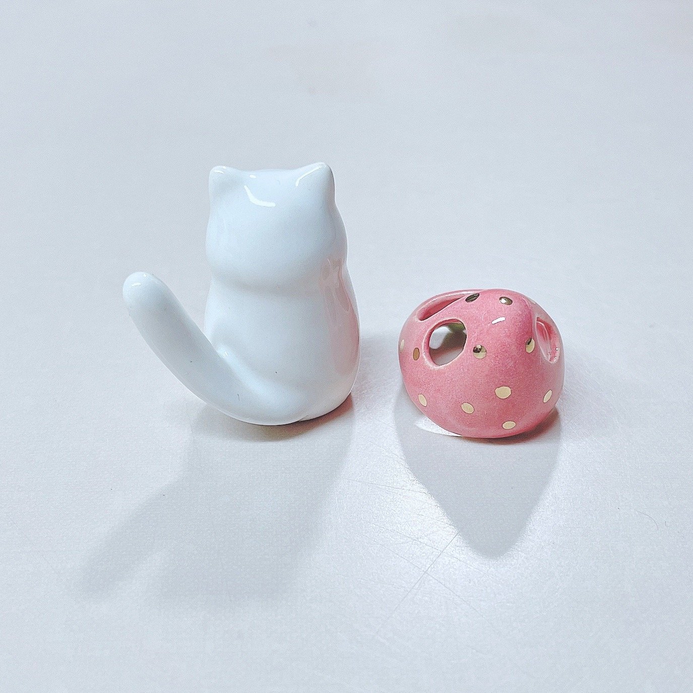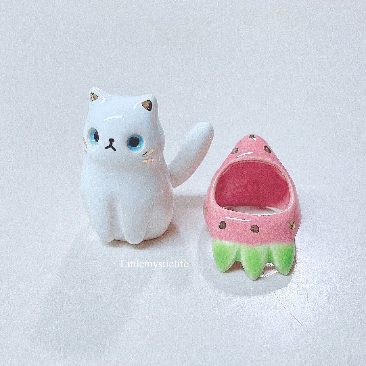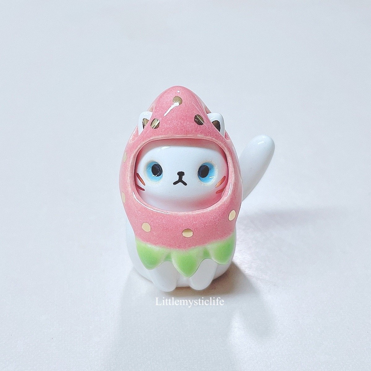 White cat strawberry hat ceramic figurine is made of low fire earthen clay and Duncan underglaze for ceramic. In order to achieve the final looking pieces, I put a lot of time and care into sculpting, glazing, and firing my pieces at the right temperature. Delicate 22k gold details are painted by hand in these pieces for elegant and shiny looking. Please handle them with care.