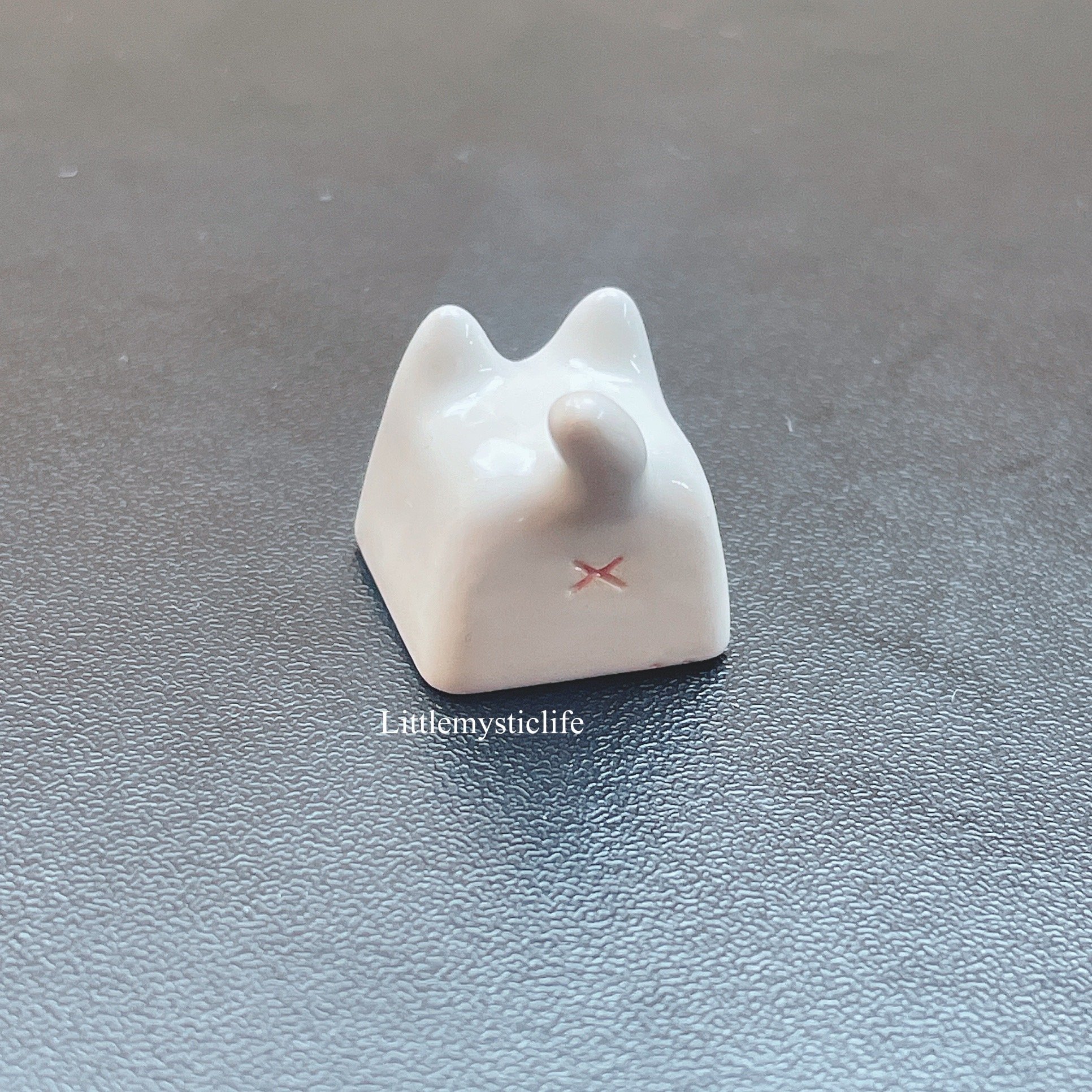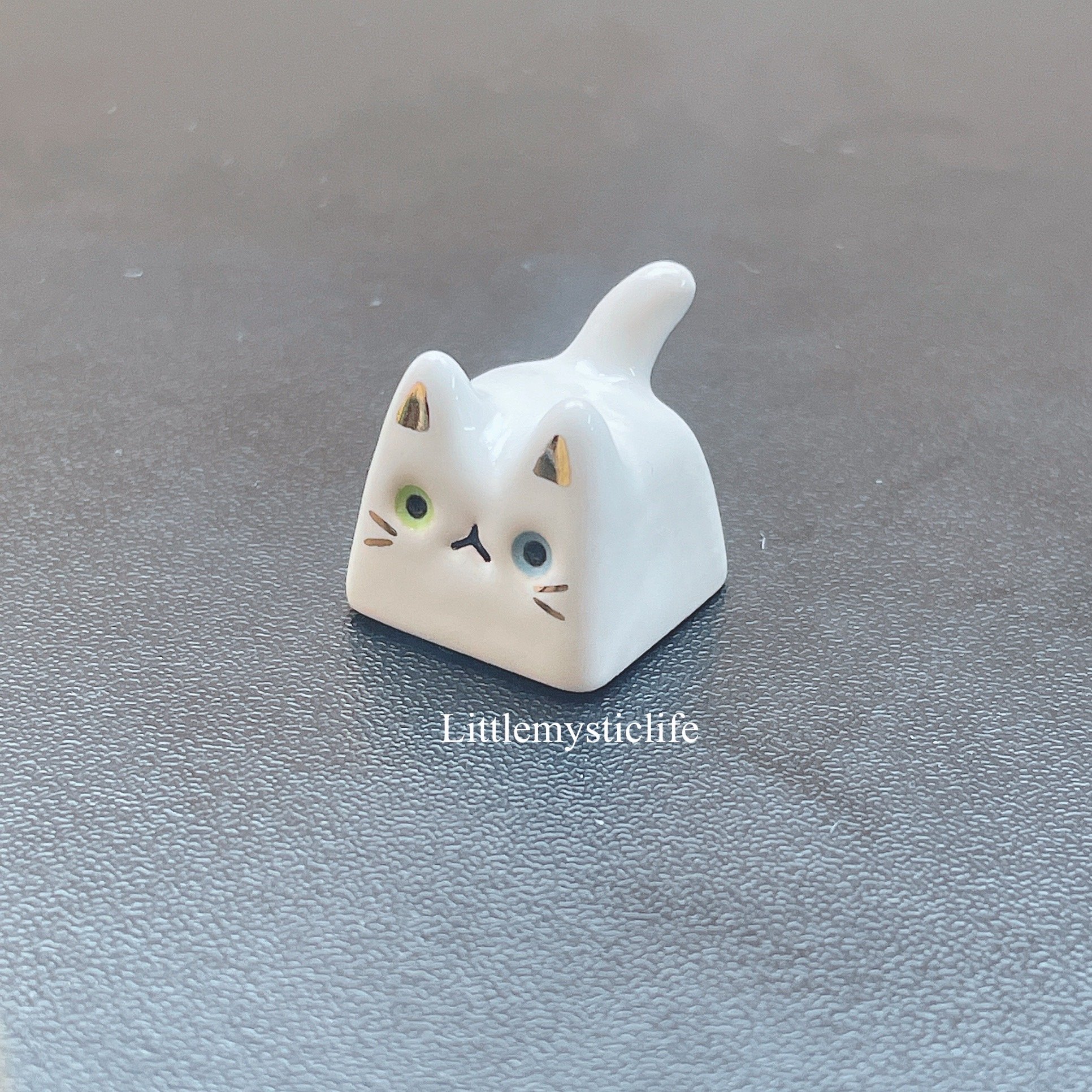 Keycap white kitty is made of low fire earthen clay and Duncan underglaze for ceramic. In order to achieve the final looking pieces, I put a lot of time and care into sculpting, glazing, and firing my pieces at the right temperature. Delicate 22k gold details are painted by hand in these pieces for elegant and shiny looking. All my pieces are very small (about as big as your thumb), please handle them with care.