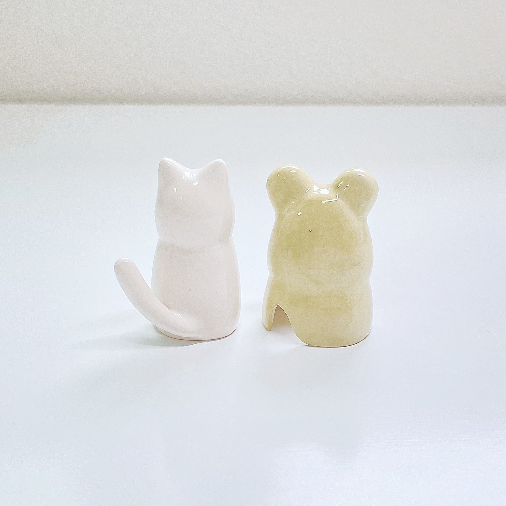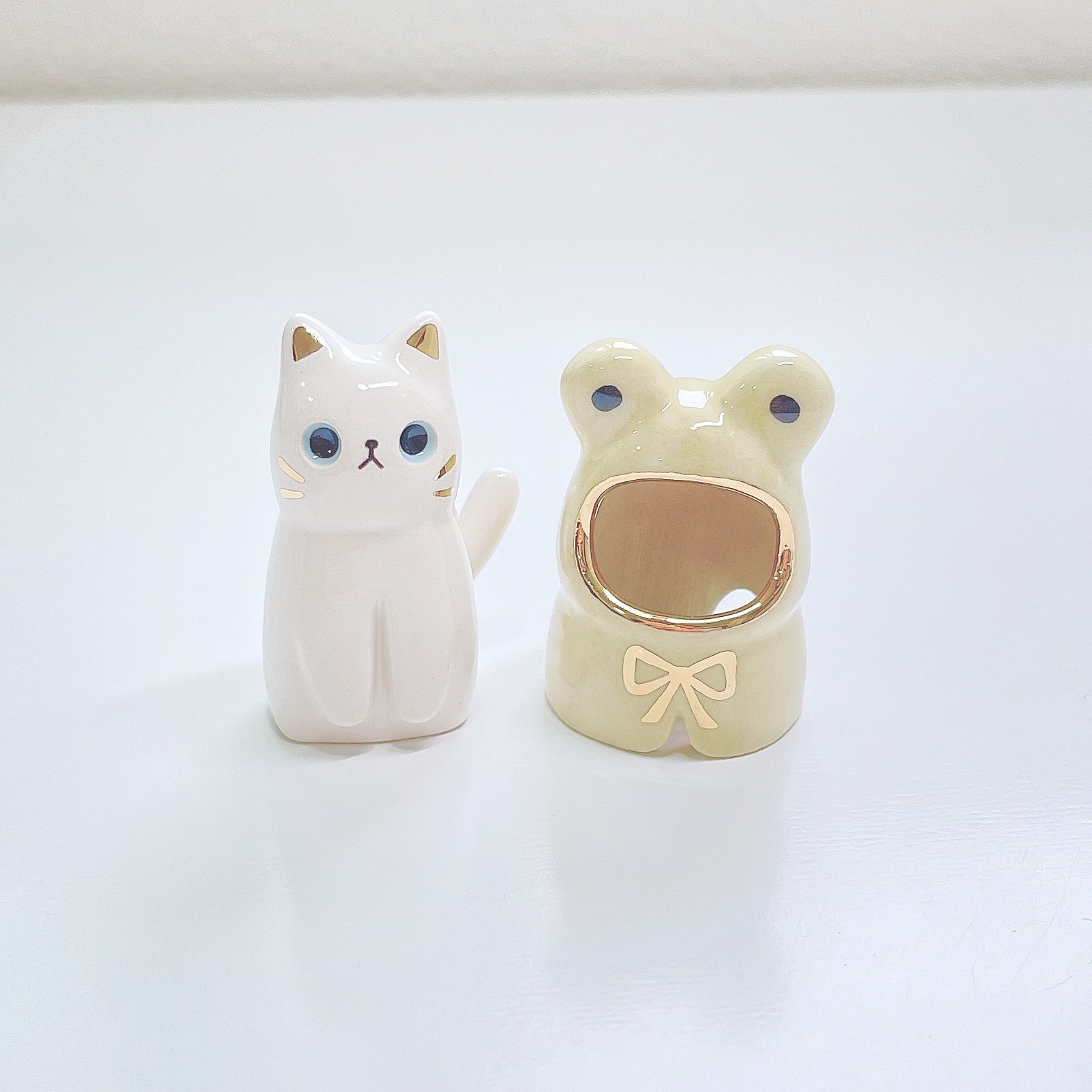 White cat with frog ponchos coat ceramic figurine is made of low fire earthen clay and Duncan underglaze for ceramic. In order to achieve the final looking pieces, I put a lot of time and care into sculpting, glazing, and firing my pieces at the right temperature. Delicate 22k gold details are painted by hand in these pieces for elegant and shiny looking. Please handle them with care.