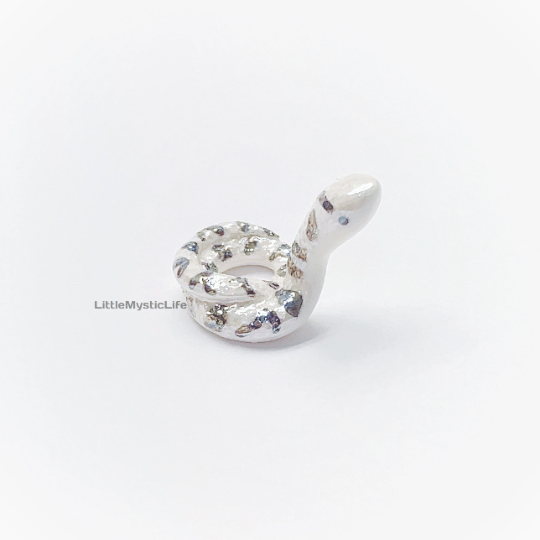 White snake ceramic figurine is made of low fire earthen clay and Duncan underglaze for ceramic. In order to achieve the final looking pieces, I put a lot of time and care into sculpting, glazing, and firing my pieces at the right temperature. Delicate 22k gold details are painted by hand in these pieces for elegant and shiny looking. All my pieces are very small (about as big as your thumb), please handle them with care and I recommend to take off your necklace while sleeping and showering.