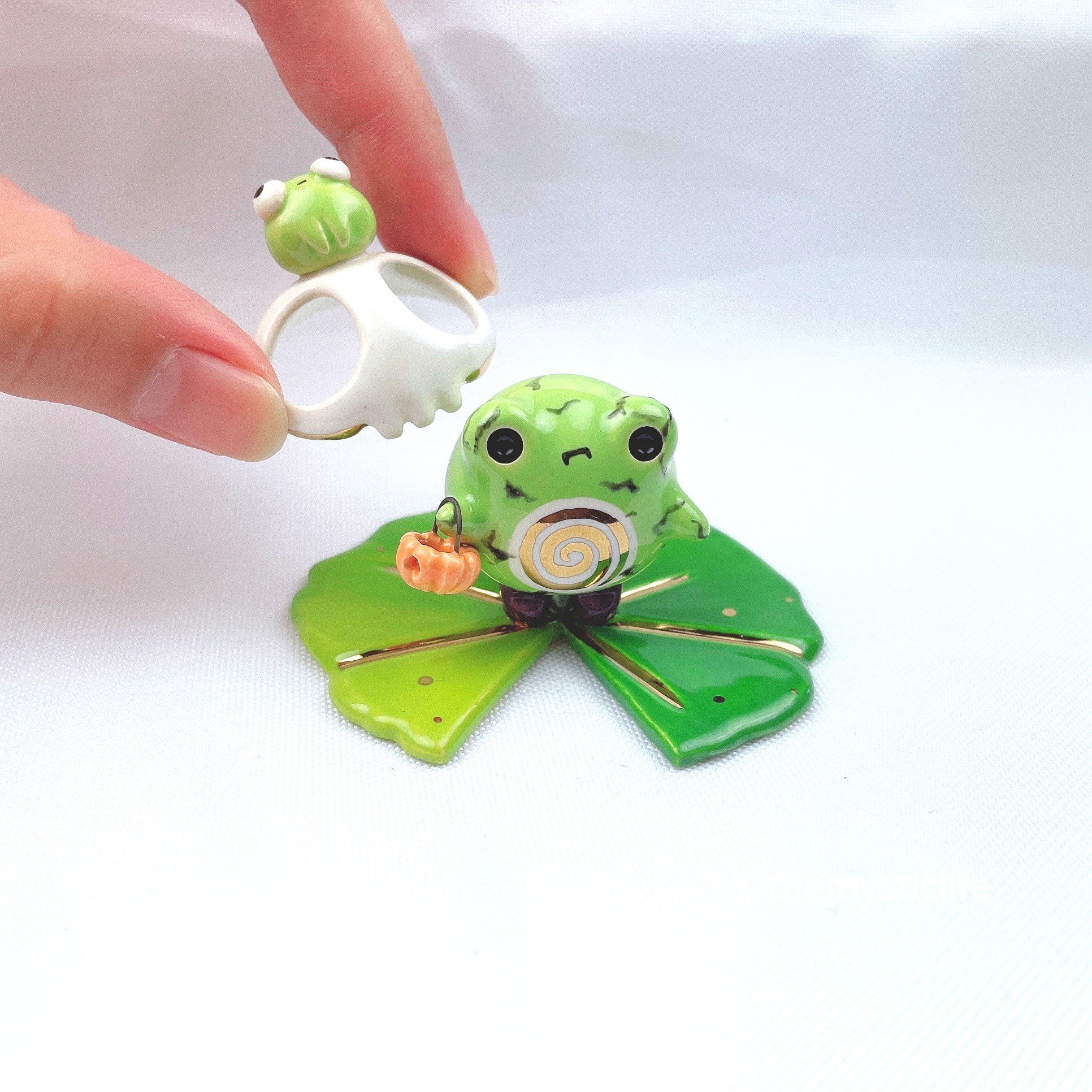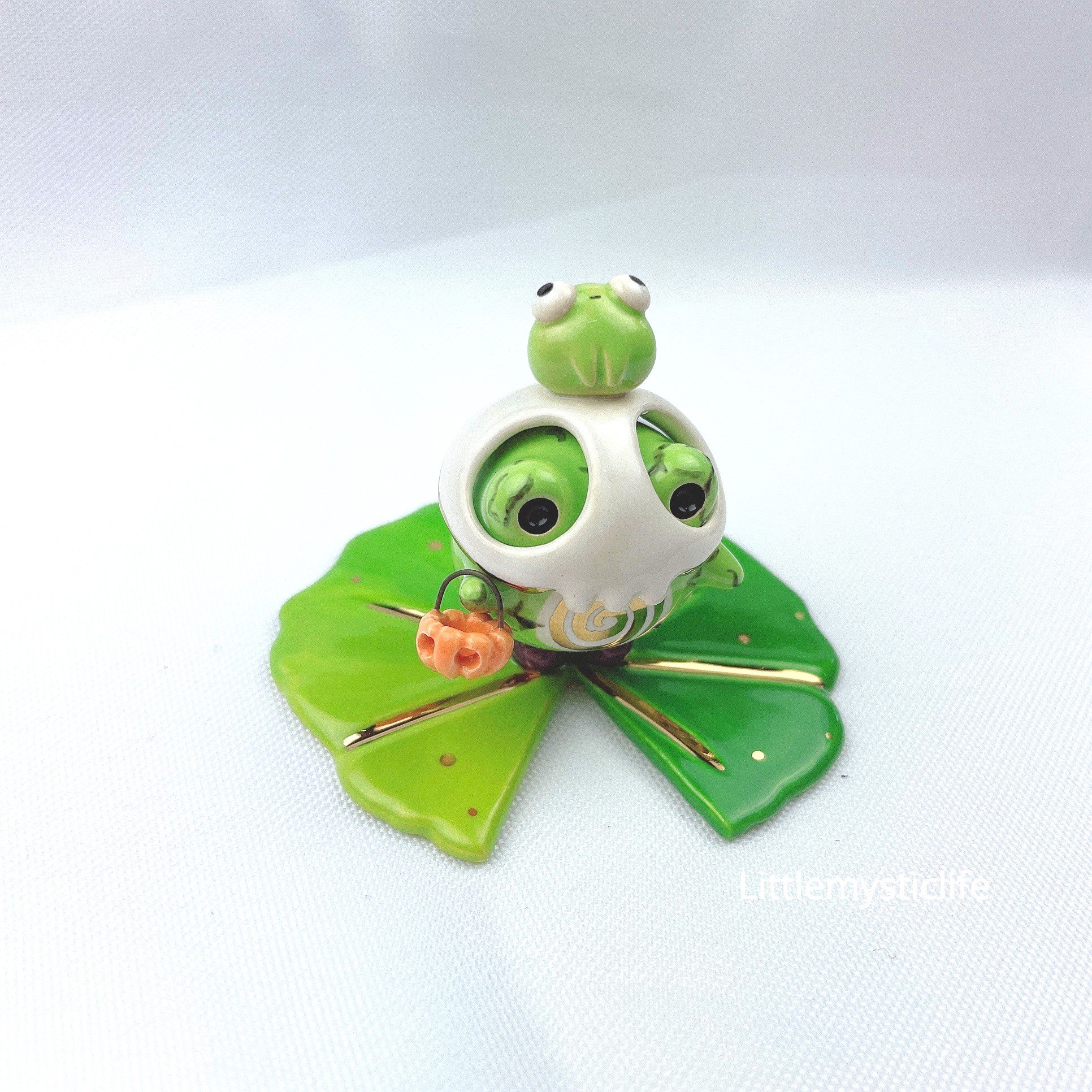 Zombie Frog on lily pad ceramic figurine is made of low fire earthen clay and Duncan underglaze for ceramic. In order to achieve the final looking pieces, I put a lot of time and care into sculpting, glazing, and firing my pieces at the right temperature. Delicate 22k gold details are painted by hand in these pieces for elegant and shiny looking. Please handle them with care.